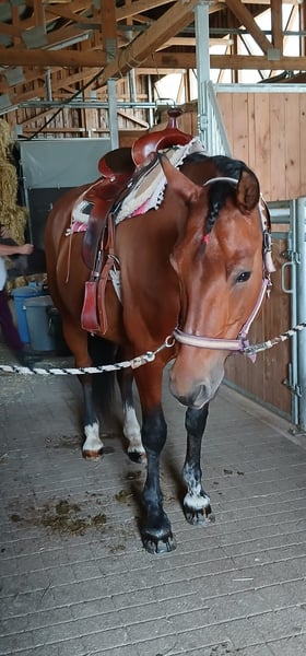 Zu verkaufen ist unsere 2009 geborene Freibergerstute Dunja. Dunja ist in der Schweiz geboren und hat einen Original Schweizer Equidenpass. Sie ist sowohl ein- als auch mehrspännig gefahren, wurde von uns aber meistens nur geritten. Ins Gelände geht sie meistens in der Gruppe, wenn geübt aber auch alleine. Sie ist nicht für Anfänger und auch nicht für den Schulbetrieb geeignet. Allerdings könnten wir uns Dunja bei einer/-m erfahrenen Reiter/-in mit eventuell 1-2 Reitbeteiligungen vorstellen. Dunja ist schmiede- und verladefromm und wurde von uns häufig auf Prozessionsritten und im Gelände geritten. Das Jahr über trägt sie vorne Hufeisen, im Winter ist sie Barfuß. Sie steht das ganze Jahr tagsüber auf der Weide und nachts im Stall. Bei weiteren Fragen stehen wir Ihnen gerne zur Verfügung.
