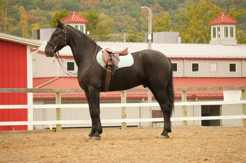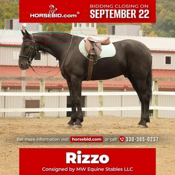 🍁𝒕𝒉𝒆 𝐅𝐀𝐋𝐋 𝑺𝒑𝒆𝒄𝒕𝒂𝒄𝒖𝒍𝒂𝒓🍁 Happening now thru MONDAY | SEPTEMBER 22nd - Available EXCLUSIVELY on HorseBid's website! For more details and to register visit: www.Horsebid.com CONSIGNOR CONTACT: MW Equine Stables LLC 330-365-0237 LOCATION: Fresno, OH BREED: Friesian Sporthorse (Friesian/Percheron/Morgan) REGISTERED: No COLOR: Black HEIGHT: 16.3 AGE: 10 GENDER: Gelding Rizzo Is a total dream horse that will get heads turning no matter where you take him. He is a 16.3 2015 Friesian Sporthorse (Friesian/Percheron/Morgan) gelding. Rizzo has no funny business and enjoys having a job and is extremely willing. He has a solid W/T/C both directions. He has a ground covering stride and pretty movement. strives to please and has work ethic. He is schooling First/Second level. Scoring First level tests in the 70’s. Jumping 3ft courses with changes, with plenty of scope. He has no buck rear or kick. He loves to trail ride and crosses all obstacles. He had been Fox hunted frequently and hunted first and second with no issues. On the trail, Rizz will happily go in the front or back of the pack. This brave boy is the first one into the water, be it crossing the stream, or going for a swim in the lake. He’s good in a group with horses riding up close behind him and doesn’t get upset. In the barn, Rizz has no bad stall habits He picks up all four feet and is good for the farrier. He stands to groom, clipped and saddled. He never causes problems in the pasture and gets along with everyone. He is a gentleman no matter the situation I trust him to take care of any level rider. Has been lightly used in lesson program and is my guest/friend/family horse for any trail or outing with inexperienced riders. Call or text 330-365-0233