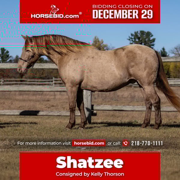 ⚜️ 𝓗𝓮𝓻𝓲𝓽𝓪𝓰𝓮 𝐖𝐢𝐧𝐭𝐞𝐫 𝓒𝓵𝓪𝓼𝓼𝓲𝓬⚜️ Happening now thru MONDAY | DECEMBER 29th - Available EXCLUSIVELY on HorseBid's website! For more details and to register visit: www.Horsebid.com CONSIGNOR CONTACT: Kelly Thorson 218-770-1111 LOCATION: Nevis, MN BREED: Friesian Heritage Horse and Sporthorse International REGISTERED: Yes REGISTERED NAME: Doubly Shatzee LW COLOR: Champagne HEIGHT: 15 AGE: 12 GENDER: Gelding Shatzee is a 15-hand registered Friesian Sport Horse gelding with a truly unique champagne color that draws attention wherever he goes. His striking look is matched by a solid, substantial build, with plenty of foot and bone to hold up for years to come. He has the kind of size and structure that gives confidence both on the ground and in the saddle. Under saddle, Shatter is an excellent trail horse. He is confident, steady, and uncomplicated, making him enjoyable to ride in a variety of environments. Whether you’re heading out for a quiet ride or covering more ground, he stays relaxed and dependable, allowing his rider to simply enjoy the experience. In the barn and around the ranch, Shotzi is extremely gentle and safe. He is kind-natured, easy to handle, and a pleasure to be around on a daily basis. His calm demeanor and willing attitude make him an easy fit for a wide range of riders looking for a horse they can trust. With his rare color, durable build, and quiet, reliable nature, Shatzee is a hard-to-find combination. He’s the kind of horse that stands out in the pasture and delivers peace of mind every time you swing a leg over him.