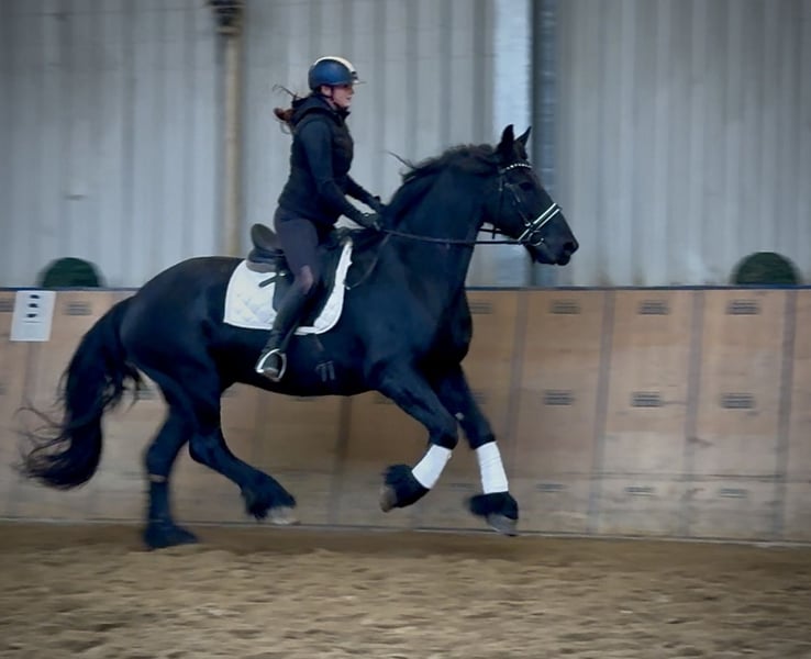Name: Pol Breed: Friesian Sex: Gelding Date of Birth: April 10, 2013 Age: 12 years Height: 16.1 hh Color: Black (Rappe) Pedigree: Available Temperament: People-oriented, reliable, patient, curious, intelligent, brave, eager to learn Training/ suitability: Riding, Dressage, Leisure riding, Baroque riding Trail Experience: Dependable, experienced both alone and in a group Health: Dewormed, vaccinated, barefoot, eczema-free, teeth checked, osteopathically treated Stabling: Box stall, open stable Special features: Very good, expressive gaits; farrier and loading-friendly; herd-compatible; suitable for tandem driving The above characteristics are based on our personal assessment and do not constitute guaranteed traits. Price: €11,900 (gross price) Have we sparked your interest? To give you a better impression of Pol, we are happy to send you a video of him riding. Of course, we are available for a detailed description of the horse, personal consultation, and to answer all your questions by phone. Please feel free to contact us anytime via WhatsApp or call us at: +49 151 19487595 Our phone hours are daily from 7:00 to 13:30 and again from 20:00 onwards. We look forward to hearing from you! A clinical or radiological pre-purchase examination can be performed by your veterinarian of choice. Pol can be safely and comfortably delivered to his new home. We take care of all necessary preparations and transport so that your new horse arrives stress-free, well cared for, insured, and in good health. Currently, we offer a carefully selected variety of horses for sale. With us, you are guaranteed to find your dream horse. Feel free to visit us on our homepage: www.marvinsroyalhorses.de. Dear customers, we are happy to introduce you to our horses and offer grooming, tacking, lunging, ground work, and trial riding in the riding hall, on the arena, or in the field to help you get to know your new family member better. This costs €40 per horse; each additional horse €30, and the fee will be refunded upon purchase. Our address: Ferdinand Grube 50 53577 Neustadt-Wied Google Maps: marvinsroyalhorses