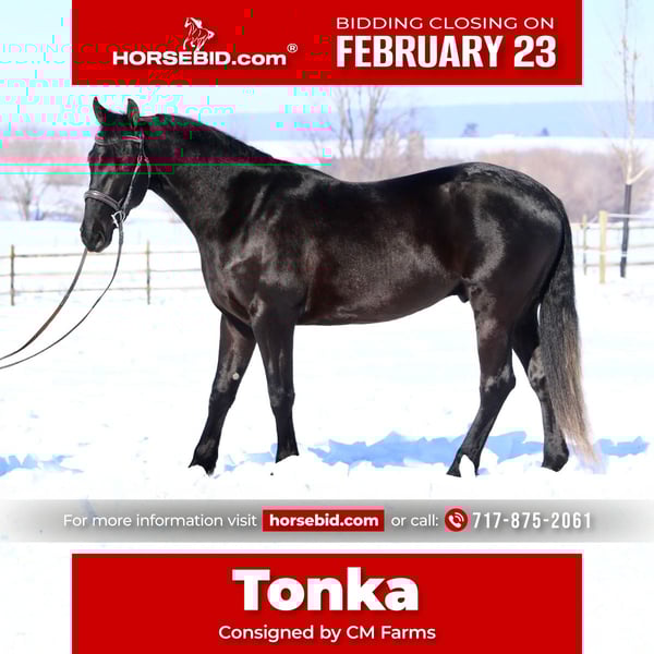 💎 𝐓𝐇𝐄 𝓓𝓲𝓪𝓶𝓸𝓷𝓭 𝐒𝐇𝐎𝐖𝐂𝐀𝐒𝐄 💎 Happening now thru MONDAY | FEBRUARY 23rd - Available EXCLUSIVELY on HorseBid's website! For more details and to register visit: www.Horsebid.com CONSIGNOR CONTACT: CM Farms 717-875-2061 LOCATION: Gap, PA BREED: QH/FriesianX REGISTERED: No REGISTERED NAME: Tonka COLOR: Black HEIGHT: 15.1 AGE: 3 GENDER: Gelding Meet ✨Tonka!✨ Tonka is a jet-black, 3-year-old QH/Friesian cross gelding standing right around 15.1–15.2hh. From the moment he stepped into our barn, he has been a breath of fresh air. He is incredibly fun, sensible, and wise beyond his years. Tonka truly has the best attributes of both breeds — curves for days, good conformation, and stunning looks. He’s a lighter-built cross, making him super versatile for a variety of disciplines! He’s been started Western, English, bareback, and has been started to drive. His work has stayed light at this age since he’s still maturing, but Tonka is the kind of smart that genuinely loves to learn and picks things up so fast. On the ground, he is an absolute lover with a young, vibrant personality you can’t help but fall in love with. 🤩 In the ring, Tonka already has a great start. He stands quietly to mount from the block or the ground, has a nice forward walk, a lovely adjustable little trot, and a rocking-horse canter to die for. He’s naturally balanced, gets the correct leads every time, can easily walk to canter, and is light and responsive to ride. He’s started going with some connection, moving off the leg, and learning to use himself properly. He’s comfortable, safe, has no bad habits, and is truly at a point where he could go in any direction and succeed — he’s a showstopper. ⭐️ This guy comes with solid brakes and will stop on a dime off your seat or a voice cue. Tonka is an absolute superstar with a great work ethic and a true will to please. He’s had lots of “craziness” thrown at him and continues to be nothing short of impressive. He’s seen tarps, smoke, equipment, traffic, dogs, flags, chickens, mini bikes, cows, pigs, ground poles, and he’s even walked through fire without batting an eye. He’s brave and confident while still being quiet, forgiving, and able to take a joke or rider mistake.☺️ On the trail, Tonka will happily lead or follow. He loads right up into the trailer and genuinely enjoys going on adventures. He’ll ride the winding wooded trails or canter out in open fields. He crosses water, logs, and bridges, and is used to hikers, dogs, bikers, and all the wildlife you find on busy trails. He’s an especially fun ride to take out and would absolutely excel at fox hunting or paper chasing. Even though he’s young, he’s wise beyond his years and is safe, reliable, and the same horse every ride. In the barn, Tonka is such a fun guy. He’s curious and a little nosey in the best way!😅 He always wants to know what you’re up to, and he’ll inspect everything! He thrives on attention and will stand on the crossties all day to be groomed, tacked, and loved on. He has good manners for the vet and farrier, picks up his feet easily, is quiet and well-behaved in his stall, and easy to handle for turnout and bring-in. He’ll literally run up when he sees you in the pasture! 😆 Tonka LOVES to play with the other young geldings and has a big personality that will keep you laughing. While he’s still young and learning, we truly couldn’t ask for a better young horse. He’s incredibly special, and we only see great things in his future. We’re looking for the absolute best home for this goofy, one-of-a-kind gelding. 🩶 UTD on Shots, Coggins, Dentist, Farrier, and Deworming.