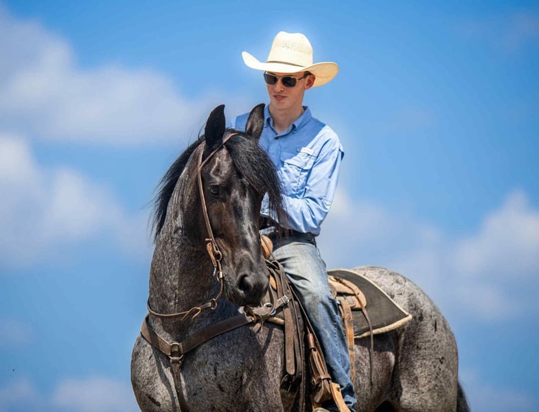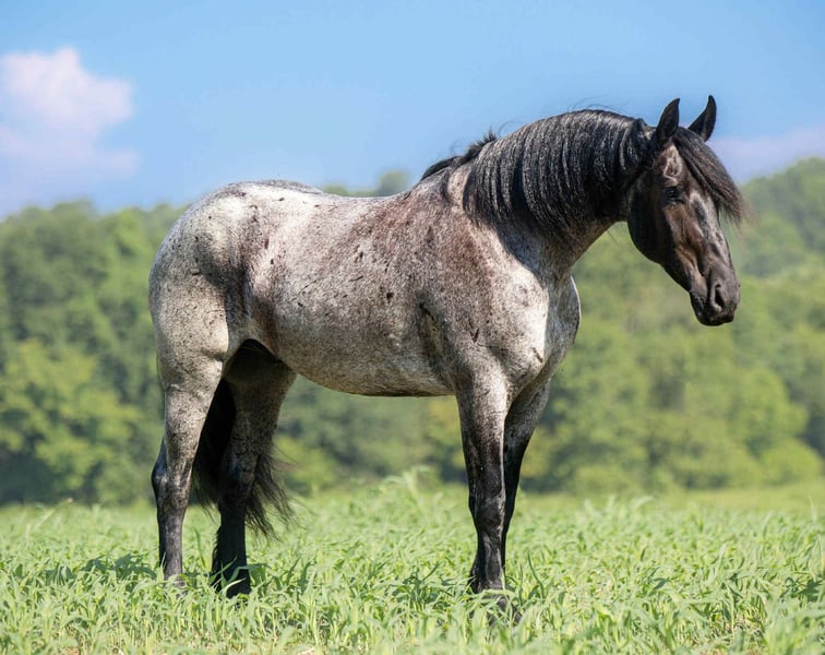 ⚜ The HERITAGE Classic ⚜ Happening now thru MONDAY | AUGUST 11th - Available EXCLUSIVELY on HorseBid's website! For more details and to register visit: www.Horsebid.com CONSIGNOR CONTACT: Jamie Thomason 270-772-1706 LOCATION: Auburn, KY BREED: Friesian/Percheron Cross REGISTERED: No REGISTERED NAME: ELLIOTT COLOR: Blue Roan HEIGHT: 15.3 AGE: 4 GENDER: Gelding Elliott is 4 yr old, Friesian/Percheron cross gelding, standing a solid 15.3 hands, boasting a rare and eye-catching blue roan coat. A beautiful mover with a fluid, ground-covering stride, he shines both under saddle and in harness. Exceptionally versatile, he’s been ridden English and Western, worked cattle on the farm, & explored miles on the trail. He’s willing, steady, and adaptable making him a standout partner for a wide range of disciplines. Elliott takes to the trail like a seasoned veteran. Crosses water, bridges, downfall, & carefully navigates various terrain. An enjoyable mount that rides out alone or in a group. In town, we’ve rode him right down Main Street. He is unbothered by passing traffic and is always up for a meet and great….someone is always asking to pet him or to take a picture. Elliot has great natural self carriage, an expressive airy trot, a rhythmic uphill canter, & smooth transitions. He canters both directions on the correct lead, moves laterally, easily controlled by feet and seat, & has been very willing taking him over cross rails at home. He shows the potential for dressage or low level eventing. Elliott enjoys the pampered life, but he isn’t afraid of a days work. He’ll push cattle, open & close gates, and pays no mind to roping strays. Elliott is also trained to drive. He is a gentleman behind the lines & traffic safe. Has even been driven to church by the kids. Elliott has undergone desensitization training. He is unbothered by tarps, is gun safe, & carries the flag. Elliott is perfectly content in a stall or can live outside. He turns out in a mixed heard, zero issues. He is always easy to catch, easy to load & haul, enjoys people, loves his baths, and is a pleasure to have in the barn. He has great, black feet, and is currently barefoot. Elliott is an exceptional, versatile gelding, truly a fun ride, awaiting his next partner. The foundation to advance in a specific discipline, as well as, the experience to be someone’s main trail companion. Buy with confidence! Elliott has a recent wellness/soundness exam with flexions, no issues! He is current on all cares, vaccinations, and comes with all documentation required for transport. If you have any further questions or would like to meet Elliott prior to adding him to your family, feel free to reach out!