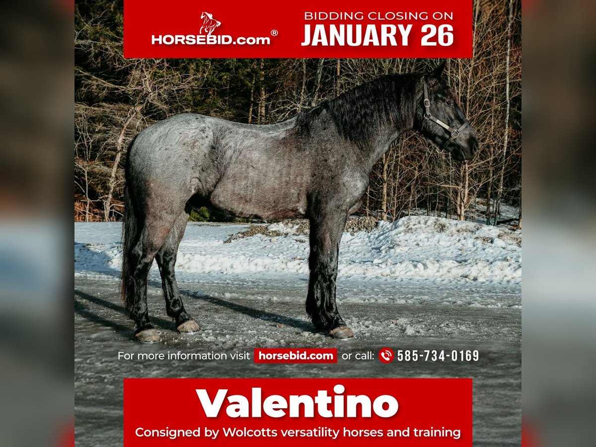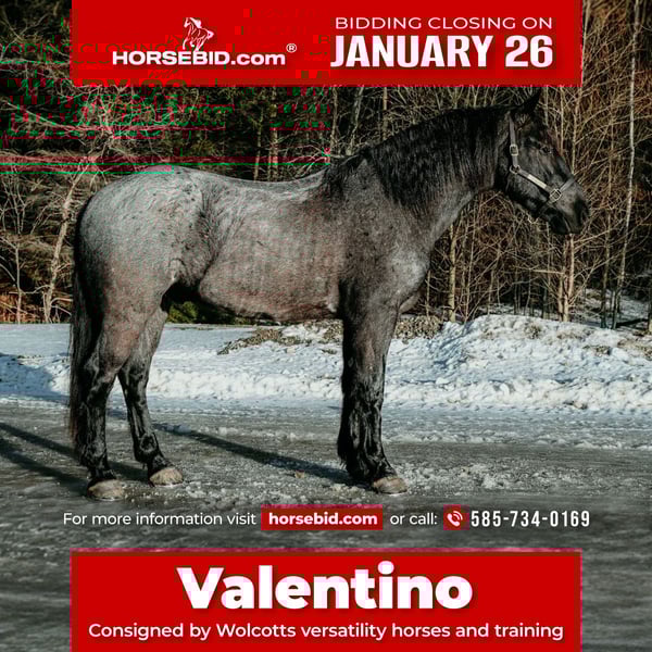 𝐉𝐀𝐍𝐔𝐀𝐑𝐘 ⭐️𝑨𝒍𝒍 𝑺𝒕𝒂𝒓 𝑳𝒊𝒏𝒆𝒖𝒑⭐️ Happening now thru MONDAY | JANUARY 26th - Available EXCLUSIVELY on HorseBid's website! For more details and to register visit: www.Horsebid.com CONSIGNOR CONTACT: Wolcotts Versatility Horses and Training 585-734-0169 LOCATION: Warsaw, NY BREED: Friesian Sport Horse REGISTERED: No COLOR: Blue Roan HEIGHT: 16.2 AGE: 4 GENDER: Gelding Introducing Valentino, with his beautiful blue roan coat, graceful movements, and confident demeanor, he is about as pretty as they come. This Friesian Sporthorse is 4-years-old, standing at 16.2HH. He has a kind temperament, is level-headed, confident, brave, and has the sweetest eye. Valentino is always ready to go to work. He has been on miles of trail rides through the creeks in the thickest parts of the woods and never refuses. He will trail ride alone or in a group, and cross any water, bridges, or obstacles you may encounter. Livestock such as cows, dogs, sheep, and goats, don't bother him; he will make friends with them all. He loads excellent and will stand patiently tied all day. Absolutely zero maintenance with him. He stands to be clipped, bathed, and for the farrier and vet. His ground manners are impeccable. He is not a picky eater; he stalls well but is just as happy in the pasture with mares and geldings. He has exceptionally smooth gaits, great transitions, side passes, and backs up. He rides great in the arena. He is very responsive to leg cues, seat, and voice. Valentino will ride on the bit or with a loose rein; he will even ride with just a neck rope. He has excellent stop, is very soft, and is responsive. Valentino also drives! He drives single and is easy to hook. He is traffic-safe. This horse has the talent to excel at anything you want to do. Put him in a show ring one day and trail ride the next; he is that type of horse. Valentino is a 100% safe and sound. Contact Dayton at 585-734-0169 to discuss Valentino and see if he is a good fit for you.