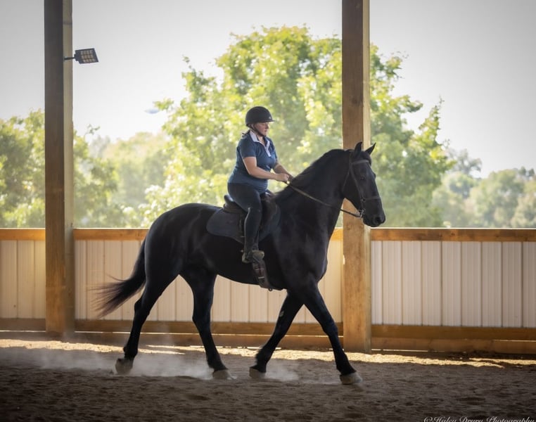 ♦️ 𝐭𝐡𝐞 𝐀𝐌𝐄𝐑𝐈𝐂𝐀𝐍 𝓕𝓪𝓵𝓵 𝓒𝓵𝓪𝓼𝓼𝓲𝓬 ♦️ Happening now thru MONDAY | OCTOBER 20th - Available EXCLUSIVELY on HorseBid's website! For more details and to register visit: www.Horsebid.com CONSIGNOR CONTACT: Jamie Thomason 270-772-1706 LOCATION: Auburn, KY BREED: Friesian Cross REGISTERED: Yes REGISTERED NAME: BIRCH FARM TED COLOR: Black HEIGHT: 16.3 AGE: 4 GENDER: Gelding The definition of equine luxury — a striking, jet-black, gelding with the size, style, and presence to turn heads! ROYCE is a 4 yr old, 1/2 Friesian, 1/4 Morgan, 1/4 Percheron Gelding registered in the Friesian Heritage Horse association, standing at 16.3 hands tall. Royce walk-trot-canters both directions, picks up the correct leads. Transitions smoothly, moves laterally, light in the bridle, & stops from your seat or a simple “whoa”. Royce is always willing, eager to learn, & forgiving making him suitable for a variety of riders and disciplines. No saddle, no bridle, no problem! Climb on and enjoy a leisurely stroll. Royce still stops, still steers, & still walk, trot, canters with nothing more than leg aids & a rope around his neck! On the trail, Royce hacks out alone or in a group. Content to lead or follow. Crosses water, goes up & down inclines, over bridges, through wooded paths, and across open pastures. Royce is easy to load, haul, and is unbothered in new settings. Myself, my daughter & her friends have taken him along to State & National Parks on day rides, he is unbothered by wildlife, hikers, and other passing riders. Always a fun time! On the farm, Royce has worked along stock dogs to move cattle. He’s ridden along side tractors, combines, atv’s, and other machinery without issue. He is traffic safe, gun safe, unbothered by waving tarps, and proudly carries the flag. Safe & seasoned around kids, dogs, cattle & other livestock. At home, Royce is exceptional. A gentleman on the ground, respectful on the lead, stands tied, cross tied, and is a very personable horse. If Royce is in the pasture, he’ll follow right behind me to the barn. My toddler is typically along for chores and Royce is always careful. He lowers his head for my son give him a pat and is extremely tolerant of a wild little boy in the barn. Royce has zero stall vices, always neat & tidy. Also perfectly content outside alone or in a mixed herd. Whether you're looking for a reliable partner for everyday riding or a head-turner with a calm, willing attitude, Royce is the kind of horse you don’t come across often. A true gentleman ready for his next adventure! If you would like to meet Royce prior to adding him to your family or have any other questions, feel free to reach out!
