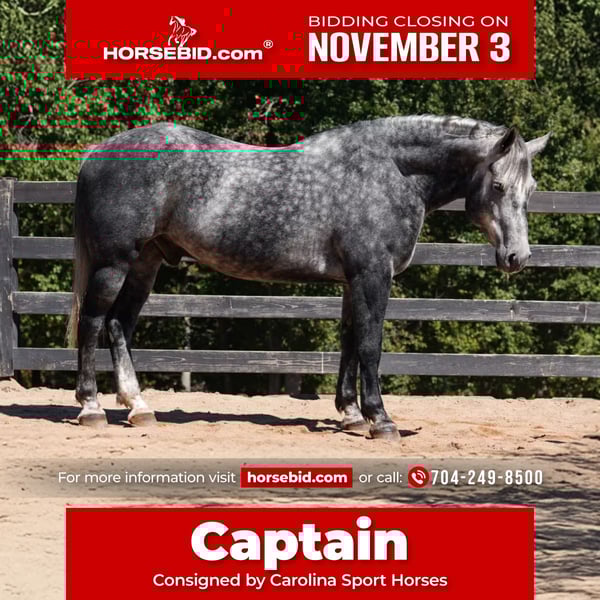 ⚜️𝐓𝐇𝐄 𝐅𝐀𝐋𝐋 𝐇𝐄𝐑𝐈𝐓𝐀𝐆𝐄 𝐂𝐋𝐀𝐒𝐒𝐈𝐂⚜️ Happening now thru MONDAY | NOVEMBER 3rd - Available EXCLUSIVELY on HorseBid's website! For more details and to register visit: www.Horsebid.com CONSIGNOR CONTACT: Carolina Sport Horses 704.249.8500 LOCATION: Clover SC BREED: Friesian Draft X REGISTERED: No REGISTERED NAME: Captain COLOR: Dapple Gray HEIGHT: 15.2 AGE: 5 GENDER: Gelding 🐴 Captain — 15.2 h Gelding Offered by Carolina Sport Horses, Clover, SC Meet Captain: a versatile, bold, and talented partner who brings all the skills of our other top mounts — and then some. He’s ready for fox-hunting, three-day eventing, trail riding, working equitation, therapy programs… you name it, he can do it. Key Highlights • Versatility & talent: Captain has the movement, scope and willingness to excel in the ring, the field and the trail. He’s ready for cross-country, fences, terrain, and challenges. • Safety & reliability: Calm, honest and steady. A rider you can trust to carry you through new situations, terrain changes, or when you’re simply looking for a dependable partner. • Tricks & fun factor: Captain adds an extra layer of sparkle with “cool-trick” capabilities (such as laying down and sitting). That makes him uniquely suited for therapy programs, demonstrations, or simply bringing a smile to your ride. • Ideal for many riders & programs: Whether you’re an amateur looking for a safe show mount, a trail rider wanting a bold yet sensible partner, or a program director searching for a standout for working equitation or therapeutic riding — Captain fits the bill. • Beauty and presence: Built to turn heads. He has the physical presence and the presence of mind to match. Why Captain stands out • His movement and scope make him a standout jumper and event-type horse. • His temperament makes him a dream for program work, younger riders, and varied disciplines. • His additional tricks add value for special programs or demonstrations — something extra that many horses can’t offer. If you’re looking for a horse that can do it all, be trusted every time, and still bring the “wow” factor — Captain is your guy. Step into a partnership that blends versatility, safety, talent, and fun. 📍 Located in Clover, South Carolina 📞 Call or Text 704-249-8500