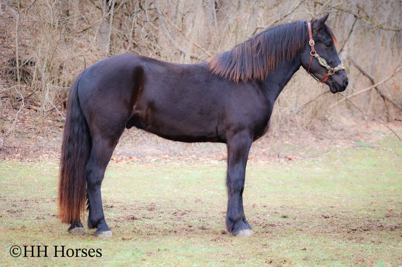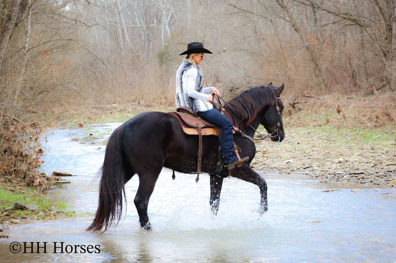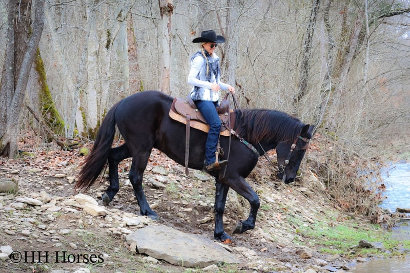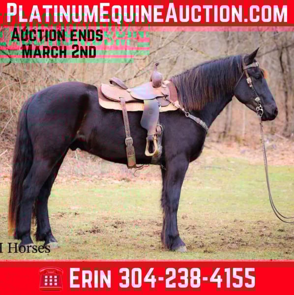 ONLINE AUCTION Place your bids at www.PlatinumEquineAuction.com Starting Bid $3500 Auction ends March 2nd, 2025 Need a new saddle? Check out White Rock Saddles on our website or Facebook! This is “MIDNIGHT THUNDER”, a fancy, intelligent, experienced, and friendly black FRIESIAN PERHCERON CROSSBRED GELDING. He is broke to ride and drive. He stands 16.1 hands tall and is 4 years old. He has been through the cross country driving courses and he has pulled a wagon, cart, and farm machinery. He has been trail ridden and will cross water quietly under harness or tack. He is quiet natured and will only go as fast as you ask of him. He has a big stop, he backs up, and moves off of leg cues. This gelding has been ridden English and Western in the indoor and outdoor arenas. He will lope nice circles, one step lope, and catch his leads. He has been ridden by youth riders with no issues. He is a horse that truly aims to please. He will ride out alone bravely or will travel peacefully in a group. He is confident, calm, collected, and cool when unloaded in new places. He has been in several holiday parades and is fine with lots of commotion, traffic, and noises. He is a very well mannered young Friesian gelding that wants to be good. He likes people, enjoys attention, and gets along well with all new horses he meets. He has been around skid steers, tractors, side by sides, and other heavy equipment. He is the hard to find kind with his ride, demeanor, training, and ability. He stands to harness, hitch, tack, mount, and groom. He stands for a mounting block and you can get on from either side of him. He will ride bareback and he has packed saddle bags. He is a nice horse that does not take advantage of timid riders. He is a great choice for anyone wanting a lifelong partner to bond with. He is easy to drive and comfortable and fun to ride. For more info or to make a Buy It Now offer contact HH Horses Erin 304-238-4155. Located in Flemingsburg, KY. ONLINE AUCTION Place your bids at www.PlatinumEquineAuction.com Starting Bid $3500 Auction ends March 2nd, 2025 Need a new saddle? Check out White Rock Saddles on our website or Facebook!