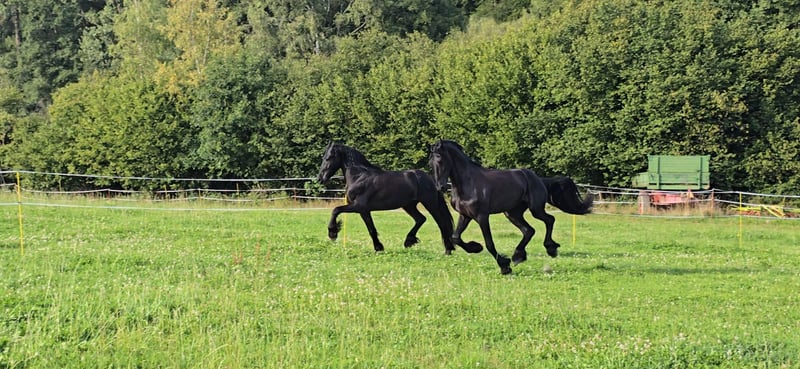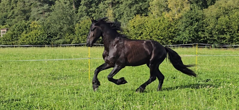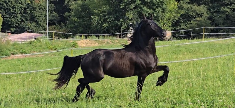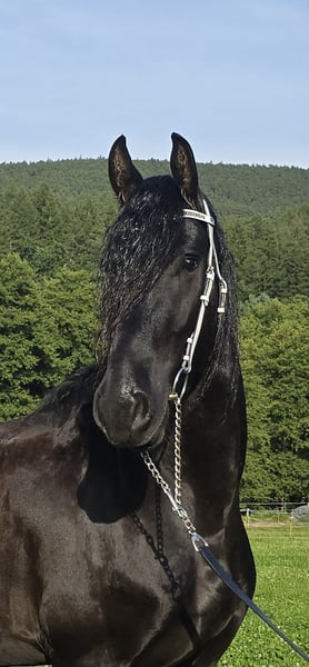 Parzival from the Ohrnbachtal – a stunning 4-year-old Friesian gelding with heart, charm, and great potential Breed: Friesian Sire: Aarnold 471 × Dam: Abel 344 Year of Birth: 2021 Height: approximately 16.1 hh Color: Black (Rappe) Location: 64720 Michelstadt Price: ... Our beautiful, homebred Friesian gelding Parzival from the Ohrnbachtal is looking for a loving new home. He captivates not only with his expressive appearance but also with his gentle, human-oriented nature and his joy in work. As a foal, he was awarded best foal at the breeding show in Schlüchtern – and even then, he demonstrated that he is truly special. Gently raised and trained with a lot of passion, Parzival now impresses with refined rideability, excellent basic gaits, and a participation in A* dressage competitions. He responds delicately to aids, is eager to learn, attentive, and always strives to do his best. His daily training includes shoulder-in, leg-yields, rein-back, and initial flying changes – he is always enthusiastic. In the terrain, he is reliable and calm, and he also enjoys jumping, including the occasional cross-country fence. Parzival is barefoot, shoe- and loading-friendly, and accustomed to both group and box stabling. A true sweetheart who seeks closeness to humans and loves to be cuddled for hours. He is very gentle with children and allows himself to be groomed and led by them as well. A dream horse for riders looking for a sensitive, honest, and talented partner for life. Video available upon request.
