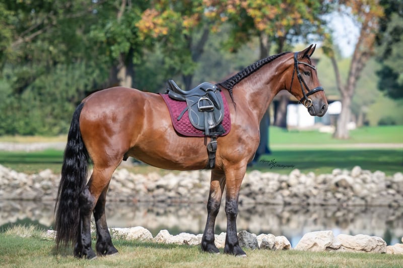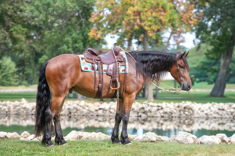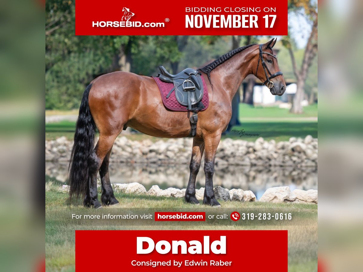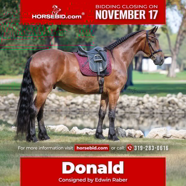 🎲𝓽𝓱𝓮 𝐑𝐈𝐃𝐄𝐑'𝐒 𝓒𝓱𝓸𝓲𝓬𝓮🎲 Happening now thru MONDAY | NOVEMBER 17th - Available EXCLUSIVELY on HorseBid's website! For more details and to register visit: www.Horsebid.com CONSIGNOR CONTACT: Edwin Raber 319-283-0616 LOCATION: Fairbank, IA BREED: FBHR Friesian Sporthorse REGISTERED: Yes REGISTERED NAME: Dutch Creek Donald COLOR: Bay HEIGHT: 16.2 AGE: 4 GENDER: Gelding One look at Donald is all it takes to confirm every reason why Friesians have been known as royal horses. He is the definition of elegance with the power to perform. Donald is a 4-year-old FBHR registered Friesian cross gelding who stands 16.2h, wears a size 3 shoe, and weighs in at approximately 1,400 lbs. He is an outstanding show prospect who has all of the potential in the world to excel in English events. Donald has been exposed to the sights on trails, obstacles in the arena, and even the hustle and bustle of small-town life. He is thoroughly desensitized and is ready to go on in his training. Donald has been started in dressage and already shows so much natural talent. He is such a beautiful mover that even people, who are inexperienced with horses, can see the raw ability that he has. Donald has been ridden extensively in both English and Western tack and has an excellent foundation in his training in both disciplines. We believe that this makes him so much more well-rounded and versatile for his next riding partner. Donald is a very forward mover, with an impressive extended trot. We feel that he would be best suited for someone who is intermediate to advanced in their showing and riding ability, or someone who is paired with a trainer. Donald could easily be paired with a beginner adult rider, with the aid of a trainer. Donald is sired by Zebb M a purebred Friesian Stallion and is out of a sporthorse mare who was 50% Friesian, thus making this stunning gelding 75% Friesian. Whether you have a preference for English or Western discipline, we believe that Donald will excel in Dressage or Western Dressage. If kept in training, he could also be very competitive in jumping, eventing, or equitation. Donald handles traffic well and is not bothered in the least by all of the distractions you typically see when driving through a small town. He crosses water without hesitation, gracefully walks over logs in a trail pattern or over downed timber out on the trail. He has been ridden around large and small livestock as well as poultry and has also been exposed to wildlife in fields and on trails. When doing arena work, Donald has been ridden in indoor and outdoor arenas, handling both with confidence. He has very impressive agility and is capable of adapting to different types of footing with ease. You can expect the same ride every time you mount up, as Donald is consistent in his performance even with extended time off. He is honest, you will have no need to worry about hump or buck, even when he is fresh. Donald is well mannered and does wonderful whether he is turned out in the paddock or kept stalled. When turned out, he gets along well with pasture mates and is easy to catch. Donald stands tied, cross ties, is a gentleman for the farrier and veterinarian, clips easily, and stands perfectly to be braided. He stands quietly to be tacked up, for polo wraps, and also stands for the mounting block. I am happy to speak with you or your trainer to ensure that Donald is the perfect fit for you. He will come with a current negative coggins and a Pre-purchase exam from my veterinarian. If you are interested in meeting Donald or have any questions prior to the auction ending, please call Edwin at 319-283-0616.