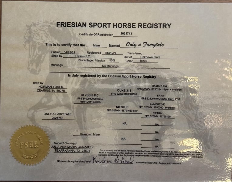 ONLINE AUCTION Place your bids at www.PlatinumEquineAuction.com Starting Bid $3500 Auction ends December 29th, 2024 Need a new saddle? Check out White Rock Saddles on our website or Facebook! This is your chance to own a horse that is not “Only a Fairytale.” Beauty is a stunning 2021 Model Registered Friesian Sport Horse mare with a glossy black coat. She combines a calm, reliable temperament with elegant, enchanting movements that live up to her name. Standing at 16.2 hands with a thick, good-boned build, Beauty is as beautiful as she is versatile. Under saddle, Beauty is well-started and confidently walks, trots, canters on both leads, and side passes with ease. She has a floating trot, an uphill canter, and has never offered a buck or displayed any silly behavior. Naturally soft and responsive, she willingly collects herself and rides beautifully in both English and Western disciplines. With plenty of trail miles under her belt, Beauty handles hills, water crossings, and traffic with ease. She rides confidently bridle less and bareback with no hesitation. Despite her young age, her steady demeanor makes her a joy to ride and handle. Beauty is also a sweetheart on the ground. She is gentle, cooperative, and easy to groom. She stands quietly for the vet and farrier and loads and hauls without any issues. She has excellent barefoot hooves, is sound and healthy, and requires minimal maintenance. All her vaccinations and worming are up to date. Beauty’s graceful movement and versatility make her an outstanding prospect for dressage, Western riding, or trail adventures. Her beauty, temperament, and potential make her the perfect partner for someone looking to develop a talented and dependable horse. If you have any question or would like to come meet Beauty in person please do not hesitate to reach out! Don’t miss this opportunity to bring this Fairytale mare into your life! Located in Texarkana, TX. Contact Julia Gonzales 430-318-8474 with any questions. ONLINE AUCTION Place your bids at www.PlatinumEquineAuction.com Starting Bid $3500 Auction ends December 29th, 2024 Need a new saddle? Check out White Rock Saddles on our website or Facebook!