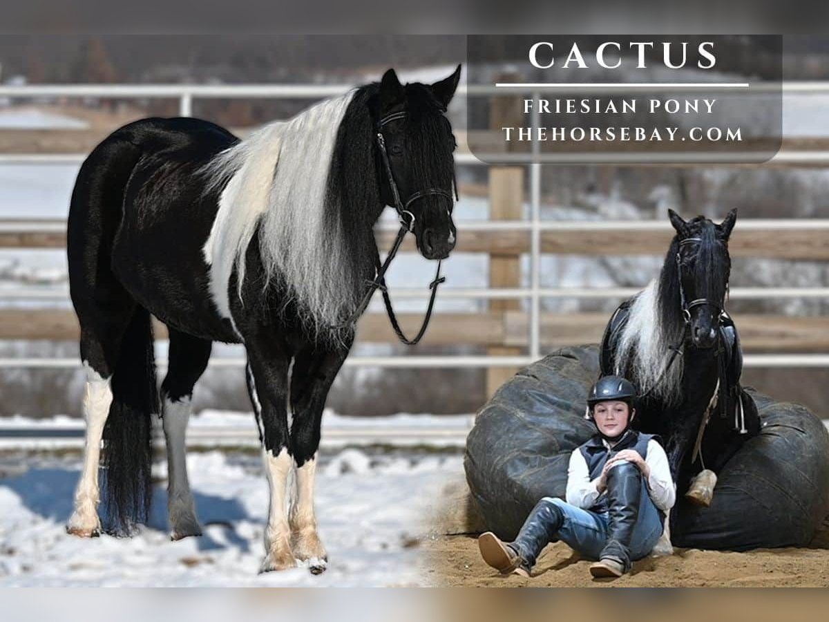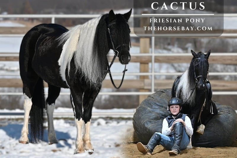 Meet Cactus — the ultimate kids’ pony! The hair, the color, the mind, the size… It’s all there. Please let me know when you find one cooler. Cactus is a 1/4 Friesian 3/4 Pony 2020 gelding. He stands 13. H. From quiet and “done it all” to athletic and versatile in the arena, this little guy has it covered. Cactus has a smooth walk, trot, and canter, with simple lead changes, a side pass, and a pivot. He’s light, responsive, and rides around like a quarter horse. He’s been started over jumps and absolutely loves it — he would excel in the jumper ring, Pony Club, etc. Cactus also goes western; he has been roped off and has pushed cattle. He’s used to all the commotion of farm life — dogs, skid steers, and more. Not only is he the most incredible dude in the arena, but he’s also great on trails. He’s quiet alone or with others, and he’s been through creeks, over logs, across ditches, etc. Cactus has also been on overnight camping trips, tied on the high line, and around covered wagons. Cactus also drives great! We don’t currently have a cart that fits his size, so we were unable to obtain videos. His previous owners drove him frequently and said he drives very well. He gets along with others in the pasture, is easy to catch, and is a sweetheart in the barn. Don’t miss out on this cute little guy — perfect for the kids and grandkids! He’s 100% sound and has no vices.
