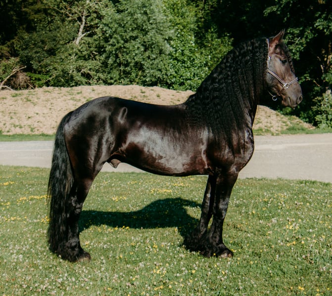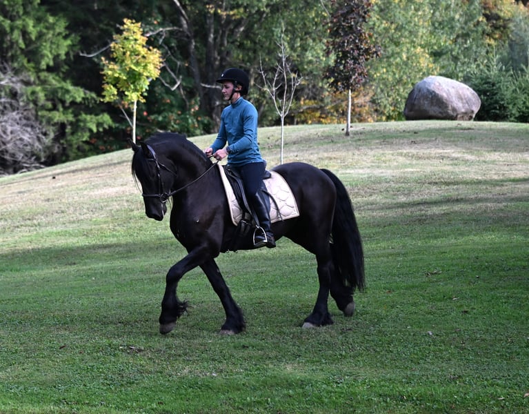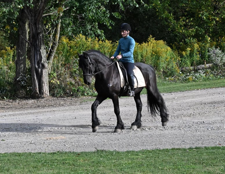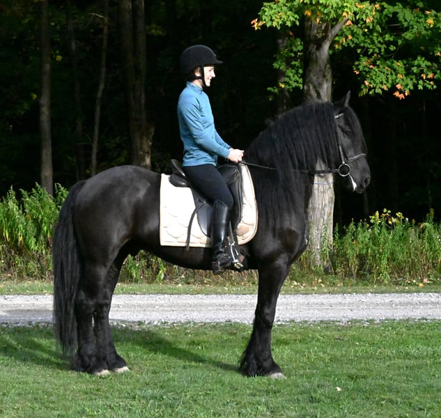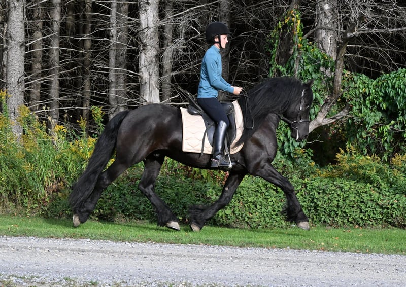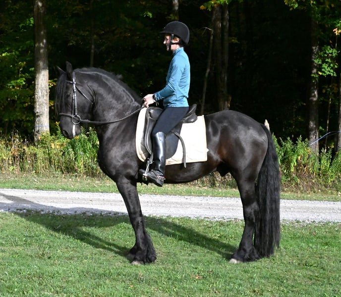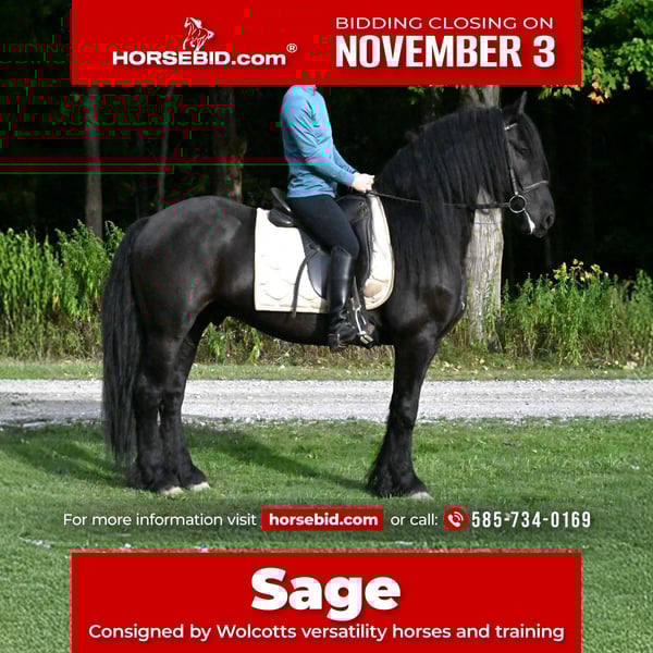 ⚜️𝐓𝐇𝐄 𝐅𝐀𝐋𝐋 𝐇𝐄𝐑𝐈𝐓𝐀𝐆𝐄 𝐂𝐋𝐀𝐒𝐒𝐈𝐂⚜️ Happening now thru MONDAY | NOVEMBER 3rd - Available EXCLUSIVELY on HorseBid's website! For more details and to register visit: www.Horsebid.com CONSIGNOR CONTACT: Wolcotts Versatility Horses and Training 585-734-0169 LOCATION: Warsaw, NY BREED: Friesian/ Morgan REGISTERED: No COLOR: Black HEIGHT: 15 AGE: 5 GENDER: Gelding Sage is a 15-hand, 2020 Friesian/Morgan cross gelding. He is very intelligent and has a gentle, pleasing personality. Watching him move all day is a joy; he is a very floaty mover with excellent conformation. Sage is a willing boy, always ready for whatever we ask! He has excellent ground manners, no vices, and requires no maintenance. He has 3 comfortable gaits, and smooth transitions. Quiet, easygoing, level-headed, and reliable sums him up. He is not sensitive-skinned, he will turn out in a large herd, and respects all types of fencing. He has a great walk, trot, and canter, side pass, backs up, and knows how to use his body. This boy is fun to ride, with a soft mouth and lots of impulsion; his work under saddle is always eager and willing to please. Sage loves trail riding! He has miles of trail experience, will cross any water, ditch, or log you encounter, and can go up or down the steepest hills. Other livestock don’t bother him; cows, dogs, sheep, goats, he makes friends with them all. He loads well and will stand patiently tied all day. With his long, flowing mane and sharply defined features, he’s a perfect model for photo shoots. This is a horse you can just get on and go. He stands quietly for the farrier and vet, and enjoys his personal grooming time. If you’re looking for a beautiful Friesian cross with movement like a Friesian, here it is! He is up to date on all shots and has a current coggins test. Sage sells 100% sound and has no vices. PPEs are welcome at the potential buyer’s expense. Contact Dayton at 585-734-0169 for more info on Sage.