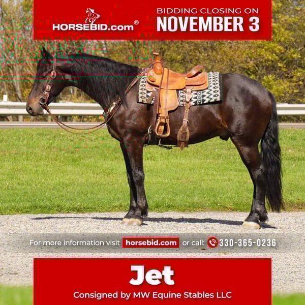⚜️𝐓𝐇𝐄 𝐅𝐀𝐋𝐋 𝐇𝐄𝐑𝐈𝐓𝐀𝐆𝐄 𝐂𝐋𝐀𝐒𝐒𝐈𝐂⚜️ Happening now thru MONDAY | NOVEMBER 3rd - Available EXCLUSIVELY on HorseBid's website! For more details and to register visit: www.Horsebid.com CONSIGNOR CONTACT: MW Equine Stables LLC 330-365-0236 LOCATION: Fresno, OH BREED: Friesian Sporthorse REGISTERED: Yes REGISTERED NAME: Jet COLOR: Bay HEIGHT: 16 AGE: 5 GENDER: Gelding Jet is 5yr. Old registered bay FSHR gelding. Standing at 16 hands tall. Jet is a true gentleman quiet, willing to please, safe and handsome. “Beautiful Mover “ He has been on our farm for the last year. He's been ridden western, English, bareback and brideless. He’s safe for the kids running around him chasing each other or simply enjoying a big horse they can canter around. He will walk, trot, canter and pick up both leads. Jet is easy to catch in the pasture, gets along well with others and is easy to Keep inside or outside. He stands great for the farrier, tacking up, grooming and baths. He will load on a trailer . Jet can be ridden in groups, or alone, on the road, open field, trails or arena. He has been ridden on moonlight rides, in the dark and does well with a .He will cross water, logs and conquers rough terrain with ease. Jet also does well in the carriage, been driven on State roads, through town and does great in traffic. He is up to date or on coggins and dewormer. If Jet sounds like the perfect fit for you but you want to try him in person, feel free to contact Marcus @ 330-365-0233 to schedule a visit. Located in Fresno, OH.
