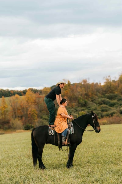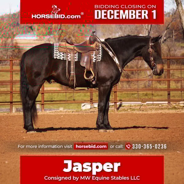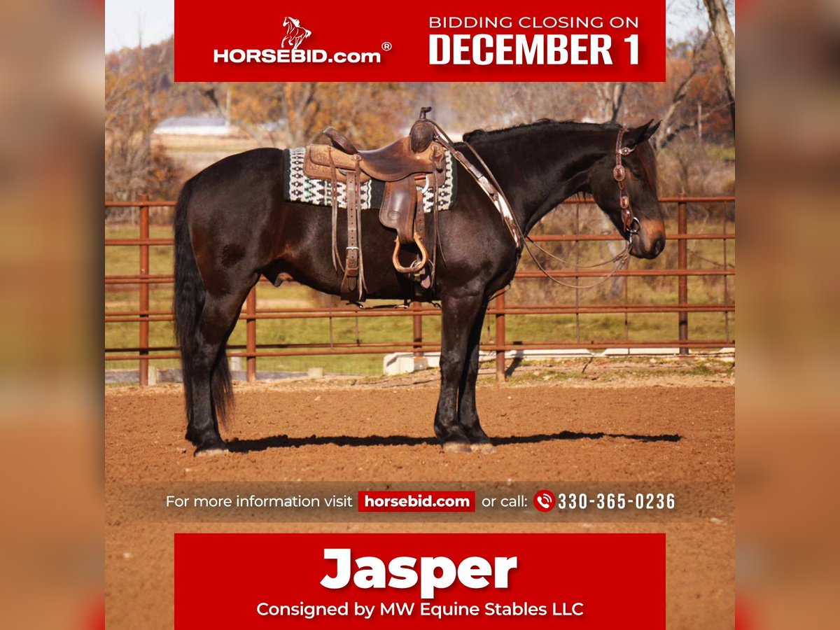 ⚜️ 𝓽𝓱𝓮 𝐇𝐨𝐫𝐬𝐞𝐦𝐚𝐧'𝐬 𝓢𝓱𝓸𝔀𝓬𝓪𝓼𝓮⚜️ Happening now thru MONDAY | DECEMBER 1st - Available EXCLUSIVELY on HorseBid's website! For more details and to register visit: www.Horsebid.com CONSIGNOR CONTACT: MW Equine Stables LLC 330-365-0236 LOCATION: Baltic, OH BREED: Friesian Draft Cross REGISTERED: No COLOR: Bay HEIGHT: 16 AGE: 5 GENDER: Gelding Jasper is a 5-year-old Draft × Friesan Gelding 16.H 1,100lbs. Where do you even start with one as cool as Jasper? He’s the total package—good-looking, versatile, and willing—ready to ride, drive, go English or Western… he truly does it all. Jasper has the quiet, easy-going nature of a Draft paired with the athleticism of a Friesian, making him a dream partner for almost any job. He willingly walks, trots, and canters balanced circles, and shows off a gorgeous extended trot. Recently started over jumps, Jasper took to it like he’d been doing it all his life—making him a great candidate for eventing, fox hunting, or simply being your steady, reliable family horse. Out on the trail, Jasper is solid and dependable for riders of all levels. He’s ponied youngsters on their first rides, crossed logs, ditches, and creeks without hesitation, and always keeps that same calm, head-level composure. Jasper also drives and has confidently navigated busy roads and heavy traffic. On the ground, he’s as sweet as they come—always at the gate to greet you, soaking up attention, and happy to be around people. He’s been exposed to dogs, cattle, and all the usual farm life without a fuss. He’s sound and clean, no vices, and excellent for shoeing, clipping, loading, and hauling. If you’re looking for a handsome, kind-hearted partner who can truly do it all, Jasper is ready to meet you. 🔔10 Day money Back Guarantee 🔔