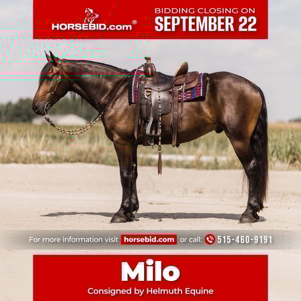 🍁𝒕𝒉𝒆 𝐅𝐀𝐋𝐋 𝑺𝒑𝒆𝒄𝒕𝒂𝒄𝒖𝒍𝒂𝒓🍁 Happening now thru MONDAY | SEPTEMBER 22nd - Available EXCLUSIVELY on HorseBid's website! For more details and to register visit: www.Horsebid.com CONSIGNOR CONTACT: Helmuth Equine 515-460-9191 LOCATION: Ames, IA BREED: Friesian X Quarter Horse REGISTERED: No REGISTERED NAME: Milo COLOR: Bay HEIGHT: 16+ AGE: 5 GENDER: Gelding Meet Milo, a drop dead gorgeous 5 year old Friesian X Quarter Horse gelding standing over 16 hands. Milo is broke to both ride and drive, and he’s willing to do anything you ask of him. He walks, trots, and canters beautifully, picking up both leads with ease. If you’re searching for that big drafty type with a true Quarter Horse jog, you’ve found your match. He will lope circles on a loose rein, rides nicely forward in English tack, and is ready to show in dressage. Milo responds very well to leg aids and has a calm, sensitive, and willing temperament. He drives confidently single, has worked with all types of farm equipment, and has experience in multiple hitches. Milo will cross water, go up and down hills, and ride out alone or in a group. Point him down any trail, and he’ll happily take you there. He would also excel in western dressage and ranch horse shows. His demeanor is the type that stays with you and always tuned in and ready to do what’s asked. With his excellent work ethic, you can trail ride one day and ride a dressage test the next. Milo gets along well with other horses, is easy to catch, and can live inside or outside. He requires no special maintenance in any shape or form. He is easy on the eyes with his striking looks and confirmation. If you’re looking for a big, solid partner who can do any discipline and enjoy it, Milo is the one.