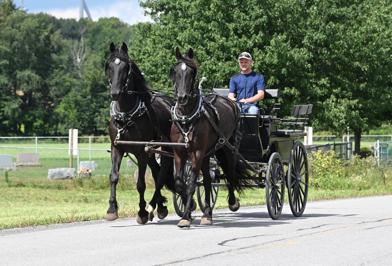 ⚜️𝐓𝐇𝐄 𝐅𝐀𝐋𝐋 𝐇𝐄𝐑𝐈𝐓𝐀𝐆𝐄 𝐂𝐋𝐀𝐒𝐒𝐈𝐂⚜️ Happening now thru MONDAY | NOVEMBER 3rd - Available EXCLUSIVELY on HorseBid's website! For more details and to register visit: www.Horsebid.com CONSIGNOR CONTACT: Wolcott’s Versatility Horses and Training 585-734-0169 LOCATION: Warsaw, NY BREED: Friesian Sport horse REGISTERED: Yes REGISTERED NAME: Bonnie and Clyde COLOR: Black HEIGHT: 16.3 AGE: 5 GENDER: Gelding Introducing Bonnie & Clyde, a registered, fully-matched Friesian sport horse driving team. Bonnie and Clyde are perfect examples of what a team should look like. Their movement and self-carriage speak for themselves. Perfectly synchronized while driving, Roman riding, or out in the pasture, this team is ready for the show ring, ceremonial events, or a lifetime of elegant pleasure driving and riding! Bonnie is a 5-year mare, and Clyde is a 4-year gelding. They are full siblings standing at 16.3hh! This team is the whole package. They ride very well in the arena and out on the trail. They will work alone without calling out for the other one. Even though they have been together their whole lives, they are not buddy sour! Bonnie and Clyde have been to many shows, clinics, dressage schoolings, and obstacle challenges! They handled everything with ease! They both have a very smooth w/t/c in the arena and outside! They have been used for lessons from kids to adults; everyone gets along with them. The kids will take them out on the obstacle course or on the trail alone! They will easily cross water, bridges, and any obstacle you encounter. When it comes to driving, this team has been hooked on all different styles of carts and carriages and never bothered with any of them. We have used them for our carriage rides around the farm and off property, and they acted like an old seasoned team! They are traffic safe and have seen many trips down the road passing semis and cars. They are very quiet in the barn; they will stand to get groomed, clipped, bathed, and for the vet. Bonnie and Clyde sell 100% sound and with zero vices! Contact Dayton at 585-734-0169 for more information. Located in Warsaw, Ny!
