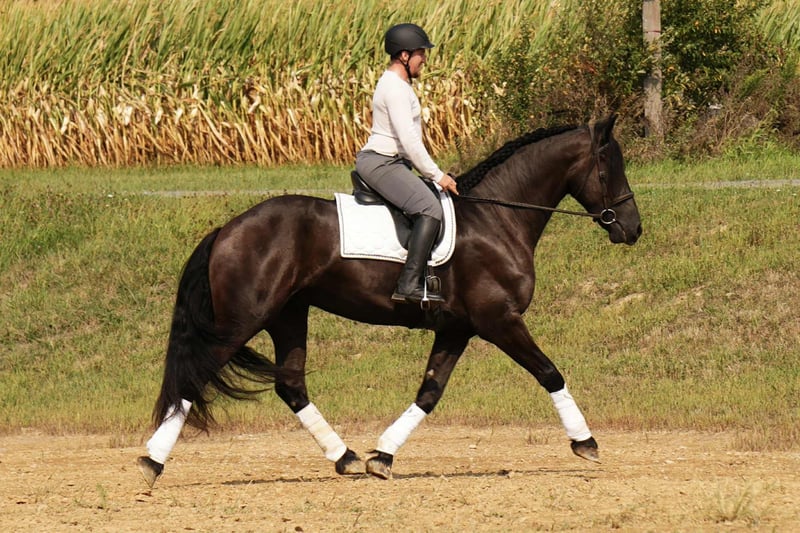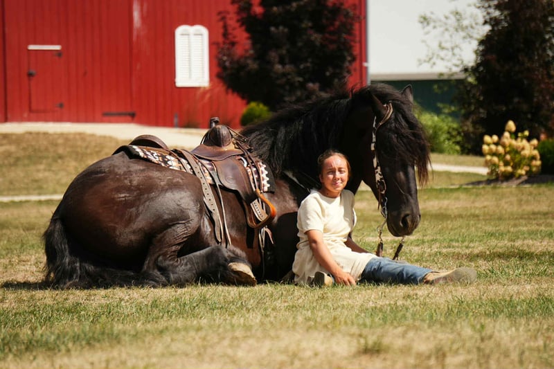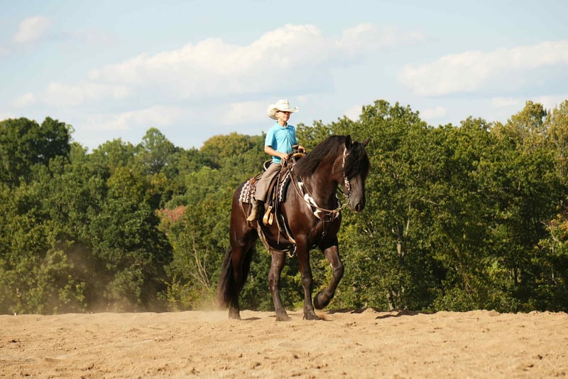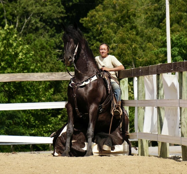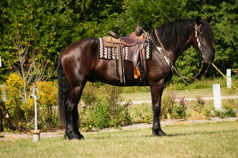 🍂 𝓐𝓾𝓽𝓾𝓶𝓷 𝑨𝑳𝑳 𝑺𝑻𝑨𝑹 𝑳𝑰𝑵𝑬𝑼𝑷 🍂 Happening now thru MONDAY | OCTOBER 6th - Available EXCLUSIVELY on HorseBid's website! For more details and to register visit: www.Horsebid.com CONSIGNOR CONTACT: MW Equine Stables LLC 330-365-0233 LOCATION: Fresno, OH BREED: Friesian/Percheron Cross REGISTERED: No COLOR: Black HEIGHT: 17.2 AGE: 5 GENDER: Gelding 🤩Take a Look at Diego …. You will not find another one like him‼️ Diego is a 5 year-old 50% Friesian 50% Percheron cross gelding. He stands around 17.2 hands. If beauty and elegance are what you’re looking for, then Diego is your guy! He has all the beautiful Friesian characteristics. Diego will do anything you ask of him. This is once in a lifetime Opportunity. Not every day do they come along like Diego ! He is quiet, calm, and collective. With his rocking chair canter, and his beautiful, elegant trot, Diego will have everyone noticing you! He is broke to ride and drive the very best . He crosses bridges, walk through the deepest waters, and will jump over the logs . He rides Western, English, bridal-less and drives. Diego also knows a few tricks, like lay down and sit.. He is a complete gentleman to be around whether being handled on the ground or under saddle. Diego makes beautiful, smooth, lead departures, great transitions, takes his lead correctly every time, and is very willing to work for you. He has been exposed to everything on the trails, making him even more prepared for the excitement that happens outside of the Arena. Diego stands crosstied , and patiently waits while bathing and being groomed , and tacked up, and bridal. While riding through town, you can take him anywhere! Down, busy, sidewalks, and streets, through parking lots of vehicles and pedestrians, across bridges, and he will have the same ride every time. On the trails, Diego will keep his rider safe. Gracefully stepping over logs, through creeks, and all kinds of obstacles you might encounter. When going for a carriage ride, Diego is easy to harness and hitch. He is trained, single and double. He will take you down busy highways, Streets , and make you feel like an absolute Rockstar . He looks stunning under harness and has enough style to stand out on the big city streets. If you’re searching for your next all around prospect ,carriage horse, family horse, or trail horse… ☑️Diego checks every box! It is a big world and the opportunities for large gelding are very rare. If you’re in the market for your forever horse, here he is! ☎️ FMI Contact Marcus @ 330-365-0233 Located in Fresno, Ohio …… Nationwide Shipping Available ‼️Feel Free to schedule a ride with Diego at our farm ‼️