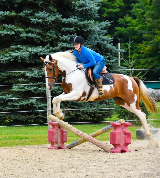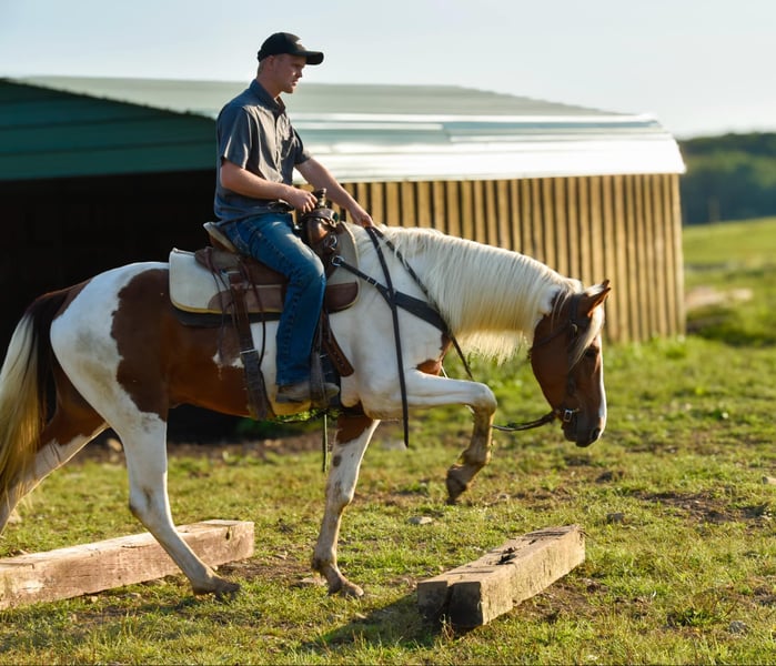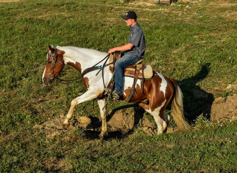 ONLINE AUCTION Place your bids at www.PlatinumEquineAuction.com Starting Bid $3500 Auction ends September 22nd, 2024 Need a new saddle? Check out White Rock Saddles on our website or Facebook! Chrome is a stunning 4-year-old Friesian/ Paint cross gelding standing at 15.1 hands. He is the type of horse that loves attention. Chrome rides English and Western and has a great handle and stunning gaits. He has a smooth walk, trot, canter, backs, and knows how to use his body. He will ride in a snaffle and has a very soft mouth. Chrome is extremely athletic and very light on his feet. He enjoys strolling along the trails or in the arena, but he is equally prepared to take a jump like a warmblood. He has lots of hind-end power and loves to jump! Chrome is safe both on the ground and under saddle. Kids, teens, and adults have ridden him, and they all enjoy him; he can take a joke and will try anything you ask! He is a trail rider’s dream horse; point him in any direction, and he’s going there. He will walk down the trail on a loose rein, cross any water and logs, and climb any hills you may encounter. He will ride with a group or by himself just the same, and is happy go lucky and always up for an adventure. He’s confident and sure-footed, making him the ultimate trail companion in any terrain. He is an absolute statue for the farrier and has excellent feet, but we keep him shod all the way around because of our terrain. Dogs, cows, sheep, goats, and donkeys don’t bother him. If you are looking for a SAFE and even-tempered horse that the whole family can enjoy and who has his whole life ahead of him, then Chrome is it! He is UTD on all shots and has a current coggins. He sells with no vices. PPE are welcomed at potential buyers expense. Contact Dayton Wolcott 585-734-0169 for more information. Located in Warsaw, NY. ONLINE AUCTION Place your bids at www.PlatinumEquineAuction.com Starting Bid $3500 Auction ends September 22nd, 2024 Need a new saddle? Check out White Rock Saddles on our website or Facebook!
