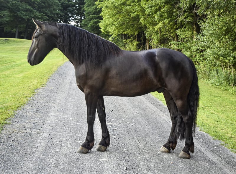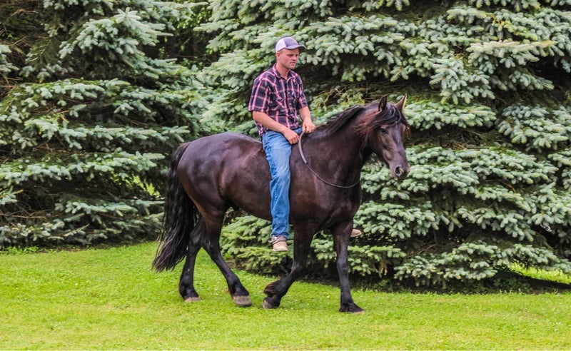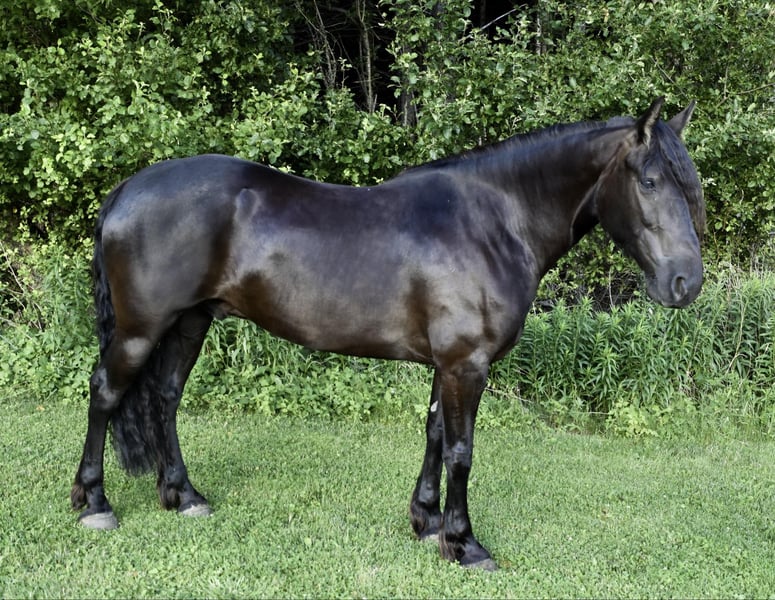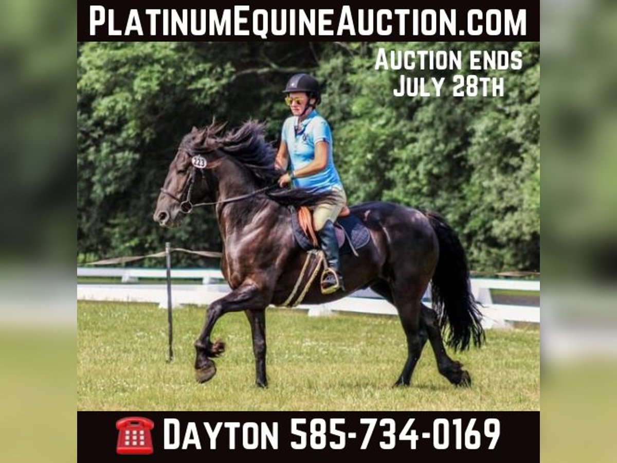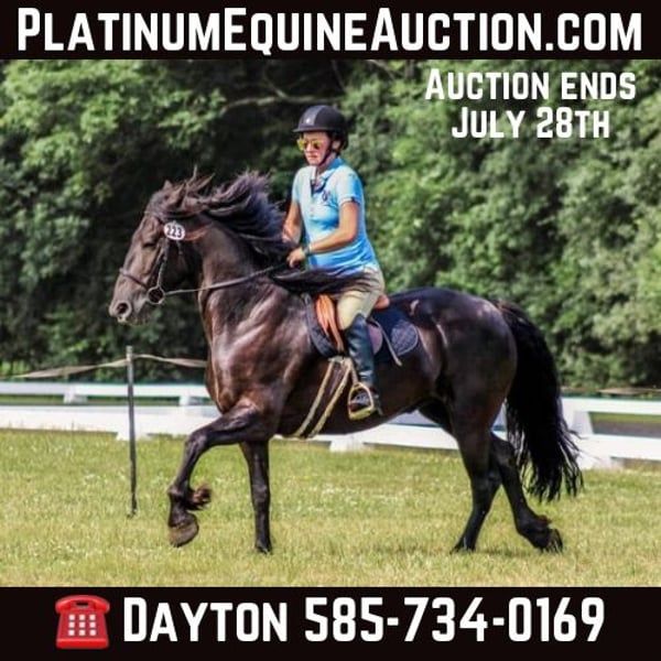 ONLINE AUCTION Place your bids at www.PlatinumEquineAuction.com Starting Bid $3500 Auction ends July 28th, 2024 Need a new saddle? Check out White Rock Saddles on our website or Facebook! He goes by the name “Leo” and is a Friesian/Morgan cross gelding standing 15hh tall. As a 5-year-old, he has his whole life ahead of him. Leo is a fancy mover and with his long mane and tail that will get you noticed wherever you go, and his jet-black coat gets him noticed no matter where he is. Leo has had many miles out on the trail with riders of different levels. We have took him to horse camp where a 14yr rode him on the trail with 10 other horses and nothing phased him. He will go anywhere he’s asked, cross water, logs, and bridges, and go up or down the steepest of hills. We put him through our obstacle course and he passed with flying colors. Leo is good with tarps, stock whips and even dragging the kids around on the sled! This horse is versatile; he can do everything from the dressage ring to a leisure trail ride, to cross country jumping derby’s . Leo will always be with you and ready to work no matter what you plan. He rides out great by himself or with a group and stands great to mount and dismount. He has been around cows, sheep, dogs, and goats. He stands quiet for clipping, bathing, farrier, and vet work. He will happily jump into the trailer; he hauls great and unloads like a gentleman. Leo moves nicely off your legs and has a nice walk, trot, lope, side pass, and back up. Leo is exceptionally versatile and loves to work. Leo sells sound with no vices. PPE are welcomed at potential buyers expense. If Leo sounds right for you contact Wolcott’s Versatility Horses Dayton 585-734-0169 for more information. Check out Wolcott’s Versatility Horses and Training on facebook! ONLINE AUCTION Place your bids at www.PlatinumEquineAuction.com Starting Bid $3500 Auction ends July 28th, 2024 Need a new saddle? Check out White Rock Saddles on our website or Facebook!