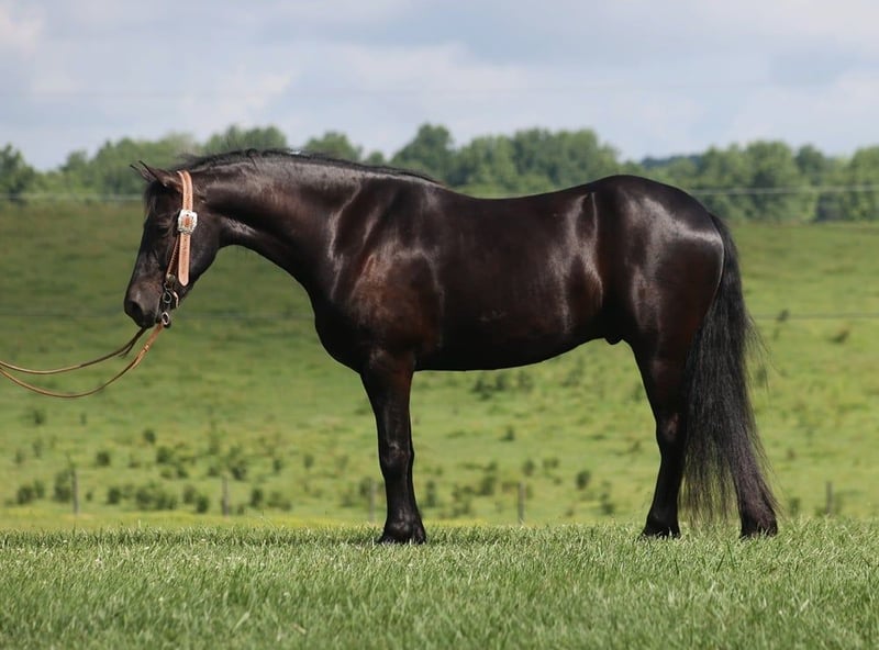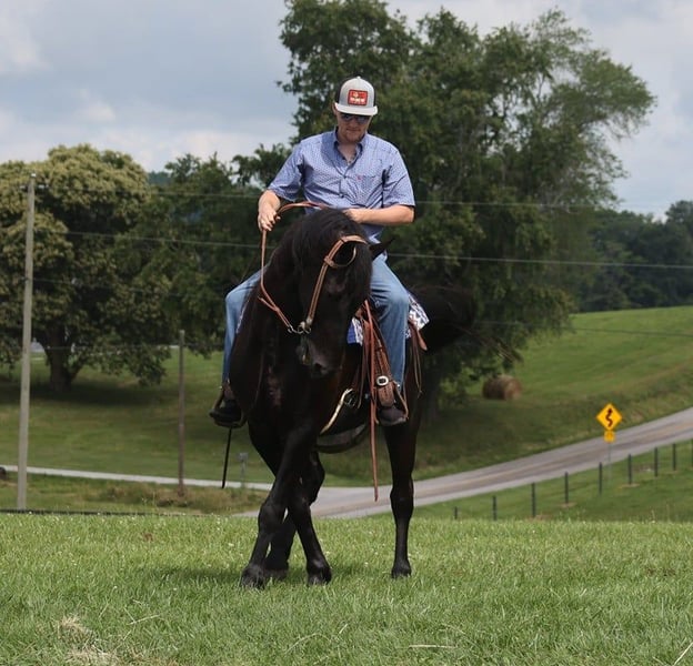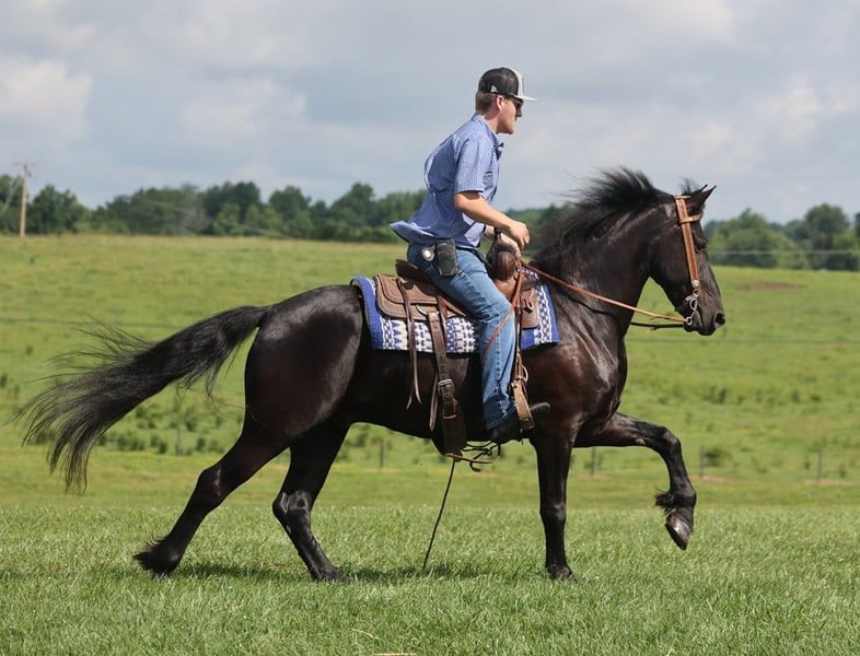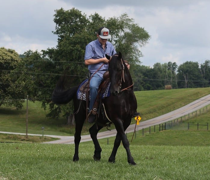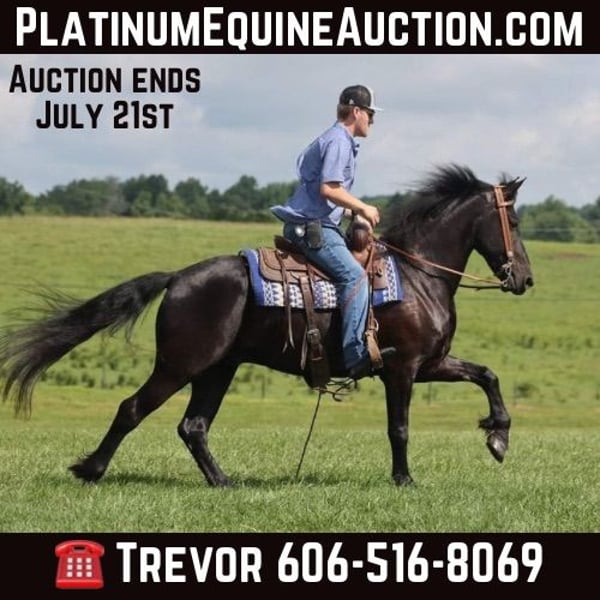 ONLINE AUCTION Place your bids at www.PlatinumEquineAuction.com Starting Bid $3500 Auction ends July 21st, 2024 Need a new saddle? Check out White Rock Saddles on our website or Facebook! Denim is a 5yr old Black Friesian Cross gelding that stands right at 15.1 hands and is as pretty as they come! He’s one of the most Gentle and people friendly horses that you will find! Not only is he friendly but he is as versatile and broke as they come, it doesn’t matter if it’s Riding English, Western, Bareback, Bridless, or Driving he’ll do it! He’ll go through rough terrain up and down steep hills, over logs and cross creeks and through belly deep water, goes through the obstacle courses, he’s one that you can cross the country with a nice loose rein and does it with ease no matter if it’s walk, trot or canter and will lope nice circles out in the open fields. He has seen many miles on the roads in very busy traffic and down town. Denim neckreins, sidepasses and backs with ease. He has three very smooth gates W/T/C and for sure his canter. He does good with the tarp, ball and bullwhip. Denim has also had a lot of English riding and is doing great with that as well, he knows all his transitions, he’s doing great on his lateral work and sure is a pleasure to ride in English tack as well, he has that smooth uphill canter what people are looking for and also if you looking for a dream carriage driving horse Denim would be the one. Denim does great being stalled and out in pasture with other and never gets into trouble he’s always quiet and takes care of himself. He is absolutely perfect to shoe my farrier has said many of times that he is a complete gentleman and does not flinch at all and that is a plus! He stands tied to be groomed, saddled and to mount and if you don’t have a stepstool you can take him alongside a fence or you name it and get on from there! So if you’re looking for that true all round family safe type horse that is suitable for the whole family and is an absolute pleasure to have around you definitely want to check out on Denim!!! If you have any questions on this pretty boy or wanna set up a time to come see him in person please contact Trevor Patrick 606-516-8069 Located in Parkers Lake, KY. ONLINE AUCTION Place your bids at www.PlatinumEquineAuction.com Starting Bid $3500 Auction ends July 21st, 2024 Need a new saddle? Check out White Rock Saddles on our website or Facebook!