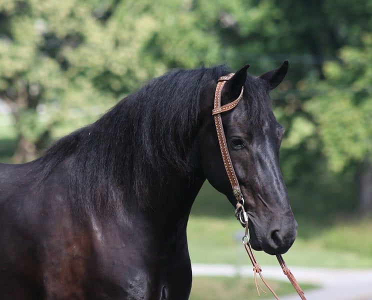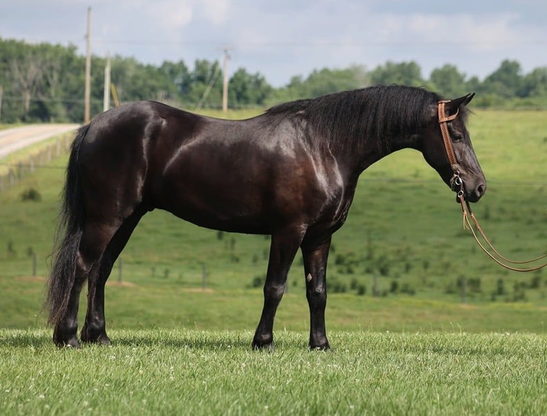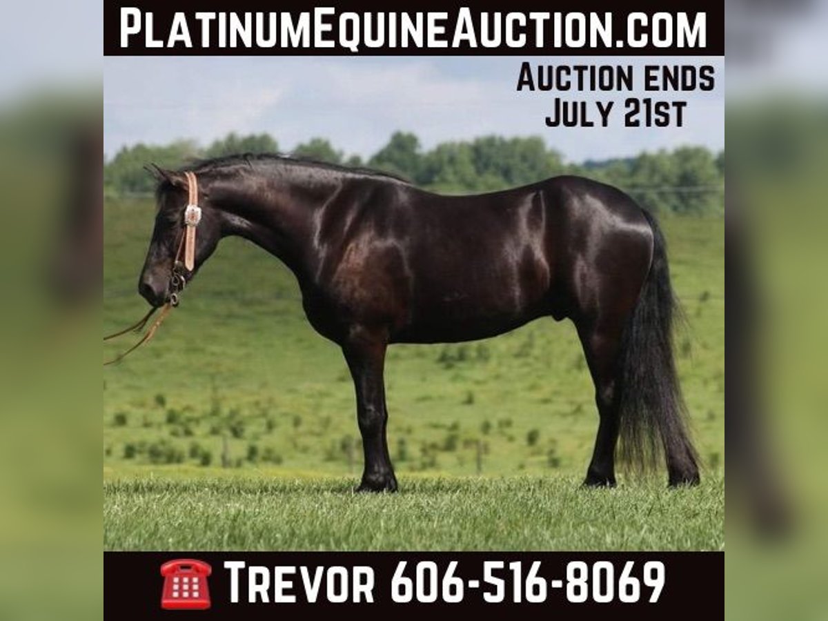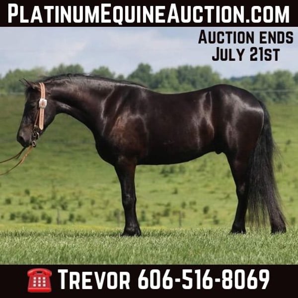 ONLINE AUCTION Place your bids at www.PlatinumEquineAuction.com Starting Bid $3500 Auction ends July 21st, 2024 Need a new saddle? Check out White Rock Saddles on our website or Facebook! Denim is a 5yr old Black Friesian Cross gelding that stands right at 15.1 hands and is as pretty as they come! He’s one of the most Gentle and people friendly horses that you will find! Not only is he friendly but he is as versatile and broke as they come, it doesn’t matter if it’s Riding English, Western, Bareback, Bridless, or Driving he’ll do it! He’ll go through rough terrain up and down steep hills, over logs and cross creeks and through belly deep water, goes through the obstacle courses, he’s one that you can cross the country with a nice loose rein and does it with ease no matter if it’s walk, trot or canter and will lope nice circles out in the open fields. He has seen many miles on the roads in very busy traffic and down town. Denim neckreins, sidepasses and backs with ease. He has three very smooth gates W/T/C and for sure his canter. He does good with the tarp, ball and bullwhip. Denim has also had a lot of English riding and is doing great with that as well, he knows all his transitions, he’s doing great on his lateral work and sure is a pleasure to ride in English tack as well, he has that smooth uphill canter what people are looking for and also if you looking for a dream carriage driving horse Denim would be the one. Denim does great being stalled and out in pasture with other and never gets into trouble he’s always quiet and takes care of himself. He is absolutely perfect to shoe my farrier has said many of times that he is a complete gentleman and does not flinch at all and that is a plus! He stands tied to be groomed, saddled and to mount and if you don’t have a stepstool you can take him alongside a fence or you name it and get on from there! So if you’re looking for that true all round family safe type horse that is suitable for the whole family and is an absolute pleasure to have around you definitely want to check out on Denim!!! If you have any questions on this pretty boy or wanna set up a time to come see him in person please contact Trevor Patrick 606-516-8069 Located in Parkers Lake, KY. ONLINE AUCTION Place your bids at www.PlatinumEquineAuction.com Starting Bid $3500 Auction ends July 21st, 2024 Need a new saddle? Check out White Rock Saddles on our website or Facebook!