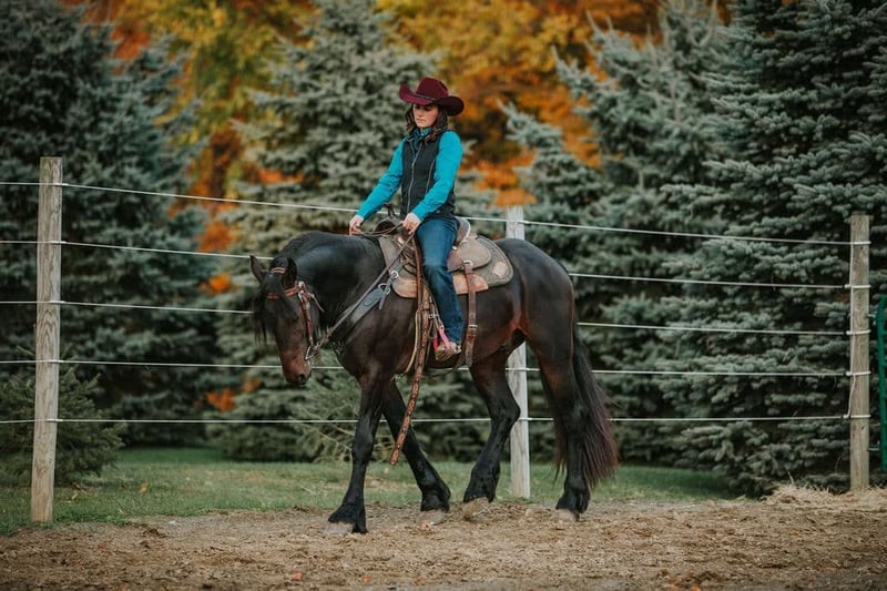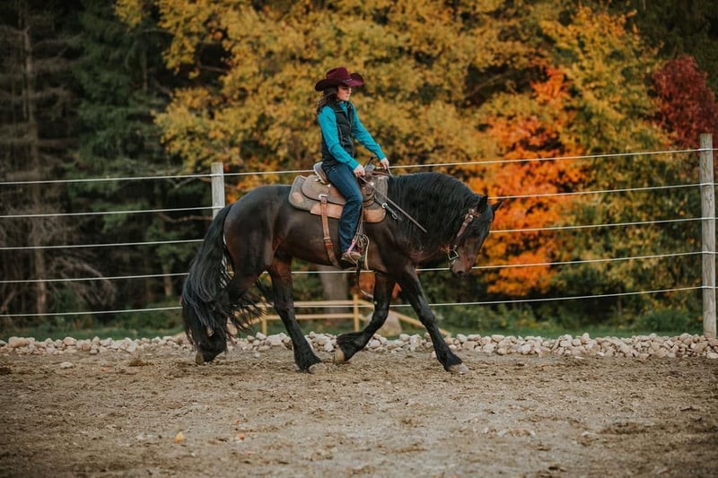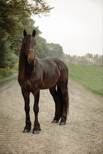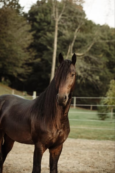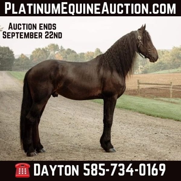 ONLINE AUCTION Place your bids at www.PlatinumEquineAuction.com Starting Bid $3500 Auction ends September 22nd, 2024 Need a new saddle? Check out White Rock Saddles on our website or Facebook! Tina’s Drew, aka “Drew,” is a 16.2-hand 2019 Friesian cross gelding. He is registered with the Friesian Heritage Horse and DNA tested. He is very smart and has a pleasing and gentle personality. He is the type of horse that comes when his name is called in the pasture and loves to get attention. You could watch him run all day; he is a very floaty mover with excellent conformation. Drew has been used in lessons with riders of all ages, multiple veteran groups, and our summer camps. He bonds with his people and wants that relationship his calm demeanor makes people fall in love with him. He is a willing boy, always down for whatever we ask! Kids handle him on a regular basis. He has excellent ground manners! No vices. No maintenance. Quiet, easygoing, level-headed, reliable mount, not sensitive skinned, turns out in a large herd of geldings and mares with various personalities and gets along with all. Mid pecking order. Respects all types of fencing. He has a great walk, trot, and canter, side passes, backs up, and knows how to use his body. This boy is fun to ride with a soft mouth and lots of impulsion; his work under saddle is always eager and happy to please. Drew has been in multiple clinics and hauled all over the state. We have had this horse since he was 2 years old! Drew loves trail riding! He has miles of trails under his feet, he will cross any water, ditches or logs you may encounter and go up or down the steepest of hills. Other livestock doesn’t bother him, cows, dogs, sheep, goats, he will make friends with them all. He loads great and will stand patiently tied all day. With his long flowing mane and sharply defined features, he has served as a model for numerous photo sessions. This is a horse you can just get on and go. Stands for the farrier, and vet. He enjoys his personal grooming time, and he is as sweet as a puppy dog. If you’re looking for a big beautiful Friesian cross that has the movement like a Friesian here he is! He is UTD on all shots and has a current coggins. Drew sells with no vices. PPE are welcomed at potential buyers expense. Contact Dayton Wolcott 585-734-0169 for more information on Drew. Located in Warsaw, NY. ONLINE AUCTION Place your bids at www.PlatinumEquineAuction.com Starting Bid $3500 Auction ends September 22nd, 2024 Need a new saddle? Check out White Rock Saddles on our website or Facebook!