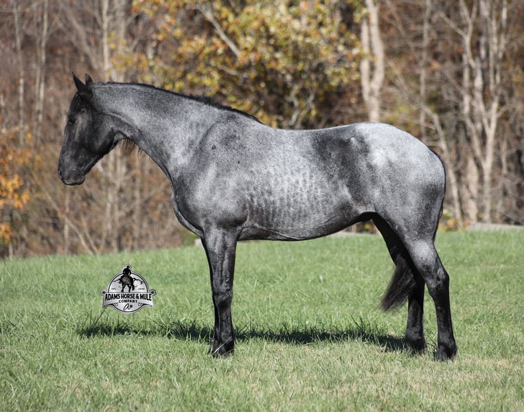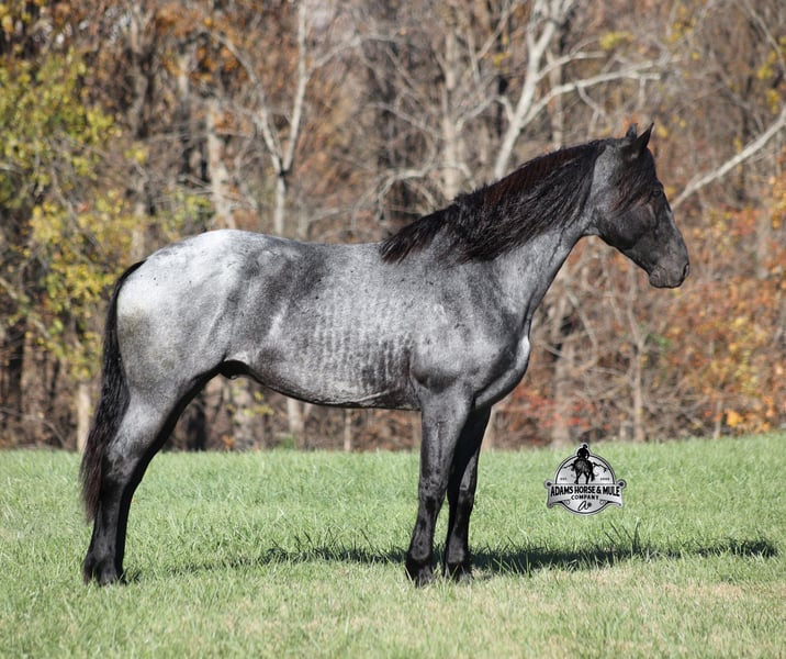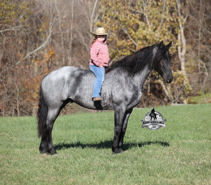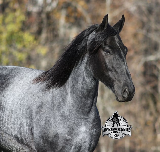 𝐀𝐝𝐚𝐦'𝐬 𝐇𝐨𝐫𝐬𝐞 & 𝐌𝐮𝐥𝐞 𝐂𝐨𝐦𝐩𝐚𝐧𝐲'𝐬 ✷𝑬𝒗𝒆𝒓𝒚 𝑴𝒊𝒍𝒆 𝑨 𝑴𝒆𝒎𝒐𝒓𝒚✷ 𝐄𝐗𝐂𝐋𝐔𝐒𝐈𝐕𝐄 𝐒𝐀𝐋𝐄 Happening now thru MONDAY | FEBRUARY 2nd - Available EXCLUSIVELY on HorseBid's website! For more details and to register visit: www.Horsebid.com CONSIGNOR CONTACT: Adams Horse and Mule Company 606-308-2461 LOCATION: Mt. Vernon, KY BREED: Friesian Heritage Horse REGISTERED: Yes REGISTERED NAME: RRS Clever Trevor COLOR: Blue Roan HEIGHT: 16 AGE: 8 GENDER: Gelding Smart and Clever, this guy has it all! RRS Clever Trevor is the big, stout, true blue roan registered Friesian Heritage Horse Gelding!!! He is a 16h+ and is a 2018 model. Trevor he is a very smooth mover as he, takes the correct leads, lopes nice circles, reins around and stops with ease! Trevor is safe for any level or any age of rider!! He has been ridden by our kids with no issues. Trevor has been ridden inside and out. He is good in the arena, he has been ridden down the highways and he is traffic safe. Trevor is great on trails and he will cross creeks, ditches, logs and navigate rough rocky areas. He has been exposed to all kinds of wildlife such as deer or turkey and will go anywhere that he is asked too. He has been ridden many miles in the mountains of Eastern Kentucky and encountered every obstacle possible on the trail. He has been on several week-long camping trips. He hauls well and picketline ties also. He will go up or down even the steepest slopes, across deep creeks, over downed trees, and over all types of rough terrain while still being sure footed. Trevor has no bad habits! In addition to riding, Trevor has been drove single, double and in a 4 horse hitch pulling an old west stage coach! He has been worked in all types of farm machinery, has been drove through town, in parades and at rodeo venues. Trevor's mate (Travis) is also available. You don’t want to miss this special horse! Feel free to call Eric 606-308-2461 with any questions.