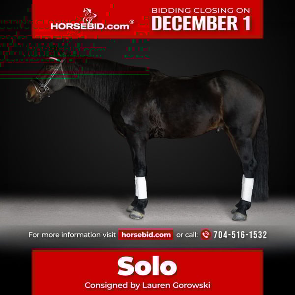 ⚜️ 𝓽𝓱𝓮 𝐇𝐨𝐫𝐬𝐞𝐦𝐚𝐧'𝐬 𝓢𝓱𝓸𝔀𝓬𝓪𝓼𝓮⚜️ Happening now thru MONDAY | DECEMBER 1st - Available EXCLUSIVELY on HorseBid's website! For more details and to register visit: www.Horsebid.com CONSIGNOR CONTACT: Lauren Gorowski 704-516-1532 LOCATION: Peyton, Co BREED: Friesian Sporthorse REGISTERED: Yes REGISTERED NAME: Ottos Cool Wander COLOR: Dark bay HEIGHT: 16.3 AGE: 7 GENDER: Gelding Solo is the head-turner you’ve been waiting for in the show ring! This 2018 Friesian x Appendix gelding is double registered with the Friesian Sport Horse Registry and Friesian Sporthorse Association. Tall, dark, and handsome, Solo stands 16.3 hands, weighs approximately 1,400 pounds, and is every bit the athletic, gorgeous partner you’d expect from his pedigree. Sired by Otto P. Ster Sport Elite—a purebred Friesian—and out of an accomplished Appendix mare from the jumping circuit, Solo carries both elegance and athleticism in his bloodlines. He is equally suited for classical or western dressage and offers a temperament that is more “whoa” than “go,” making him junior and adult amateur friendly. True to his Friesian heritage, he’s a pocket pony who loves attention. Solo has extensive classical dressage training and shines in both indoor and outdoor arenas which he prefers more than the trails. He is confidently showing at Second Level, schooling Third Level with baby changes, and already demonstrating talent for canter pirouettes, half pass, working piaffe, and more. His canter is truly exceptional, and he goes comfortably in a snaffle, curb, or double bridle. At local shows, Solo has earned scores of 62.2% (Level 2 Test 1) and 59.4% (Level 2 Test 2). His wellbeing is carefully maintained with routine chiropractic adjustments and monthly saddle fittings which is the preference of the owner. Solo is as easy to manage as he is to ride—he ties, cross ties, stands for the vacuum, bathes, blankets, loads, and hauls with ease. He lives out 24/7 in the field or stalls beautifully, and remains the same horse even with time off. He is up to date on vaccines, farrier (barefoot), and all care. He has no vices. I’ve owned Solo since he was six months old, and he has grown into a true performance horse who loves to work and show off his dressage skills. He is ready for his next competition home, and while my own interests have shifted back to western riding, Solo is eager to continue his journey in the show ring with a rider who appreciates his talent and heart.