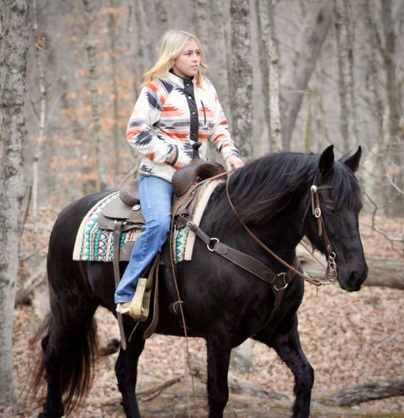 𝐉𝐀𝐍𝐔𝐀𝐑𝐘 ⭐️𝑨𝒍𝒍 𝑺𝒕𝒂𝒓 𝑳𝒊𝒏𝒆𝒖𝒑⭐️ Happening now thru MONDAY | JANUARY 26th - Available EXCLUSIVELY on HorseBid's website! For more details and to register visit: www.Horsebid.com CONSIGNOR CONTACT: Circle C Performance Horses 812-704-6388 LOCATION: Borden, IN BREED: Friesian Sport Horse REGISTERED: Yes REGISTERED NAME: Karina COLOR: Black HEIGHT: 14.2 AGE: 11 GENDER: Mare Karina 2015 Registered Friesian Sport Horse Mare | 14.2 Hands Karina is a striking black Friesian Sport Horse mare offering the elegance, movement, and presence of the Friesian breed in a more manageable and rider-friendly size. Standing 14.2 hands, she is big-bodied and well balanced, able to comfortably carry a variety of riders without ever looking out of proportion. Her size makes her an excellent option for those who admire the Friesian look but prefer a smaller, more approachable mount. She has been extensively ridden both English and Western and has competed in schooling and open shows. Karina is soft, responsive, and willing, with smooth, correct transitions and an adjustable way of going. She can slow jog quietly for Western riders and shows off a beautiful, expressive extended trot in English. While not formally trained over fences, she is confidently worked over ground poles and regularly hops logs and natural obstacles on the trail. This mare is far more than just an arena horse. Karina is a seasoned trail mount that has been ridden through pastures, on trails, and down the road through town. She confidently handles water crossings, rough terrain, and rides out alone without hesitation. She is experienced with overnight camping trips and stands quietly tied at the hitching rail. Karina is well mannered on the ground, easy to groom, stands quietly for tacking, and is respectful for the farrier. She loads and unloads easily in the trailer, stalls well when needed, and gets along nicely in a mixed herd setting. She can be kept barefoot or shod, depending on the new owner’s preference. She has no vices. Extremely versatile, uncomplicated, and enjoyable to ride, Karina is the type of mare that most riders will get along with immediately. She is suitable for a wide range of disciplines and riding styles, making her a wonderful choice for someone seeking an elegant, dependable, and well-rounded Friesian Sport Horse. For more information, please call 812-704-6388.