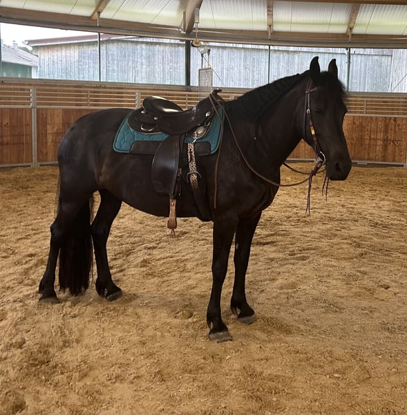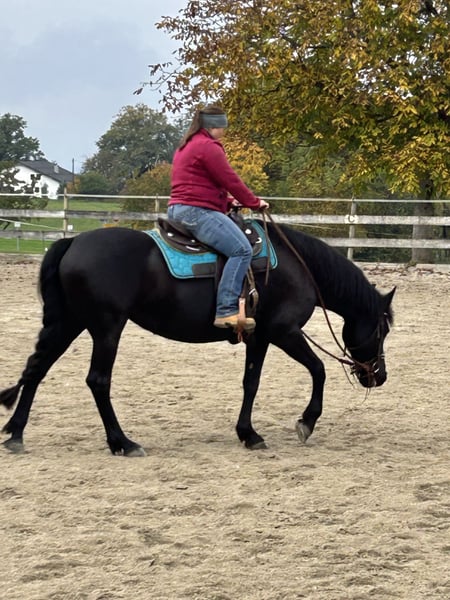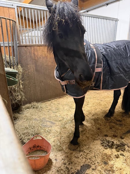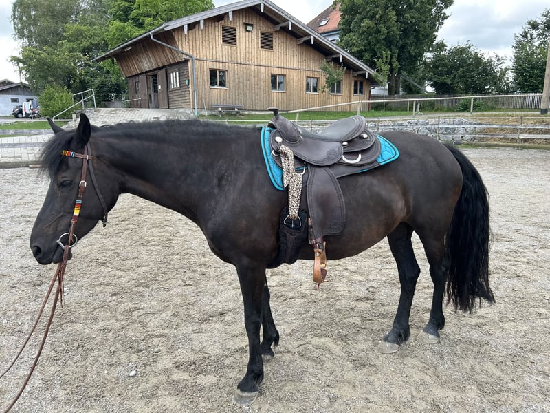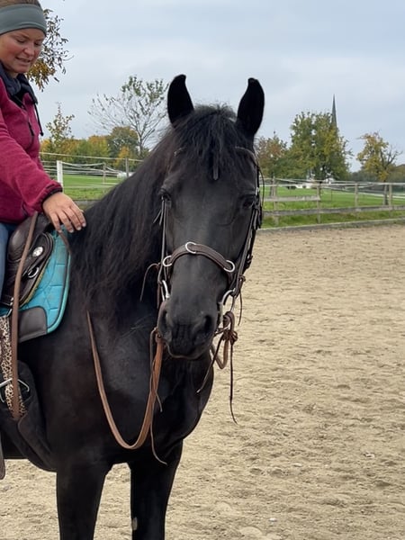 Hello, I am selling my beautiful 11-year-old mare, a Western leisure-ridden Friesian-Connemara cross with an approximate height of 15.8 hands. She is a typical mare, completely honest, with a lot of "go." Since she belongs to the more sensitive type, she is looking for a calm, experienced, and confident rider who can provide her with security and lead her with patience and heart. She loves to be regularly worked or ridden and shows excellent stamina and motivation during riding. Once she has truly built trust, she will go anywhere with you! To feel truly comfortable, she needs an overnight paddock box or stable where she can rest, sleep, and eat in peace. During the day, she is happily turned out on the paddock or a large winter paddock in a herd of mares. She is positioned in the middle rank within the herd. A few years ago, she developed some stomach issues and a summer eczema. Both problems are completely resolved with proper management and feeding! A recent gastroscopy from the equine clinic in October 2025 shows no abnormalities. Her teeth are regularly floated, and she is dewormed and physiotherapy is done regularly. The farrier comes every 4-6 weeks for barefoot hoof care. If you are interested or have any questions, please feel free to contact me via WhatsApp or give me a call! Phone: 0151-15514727