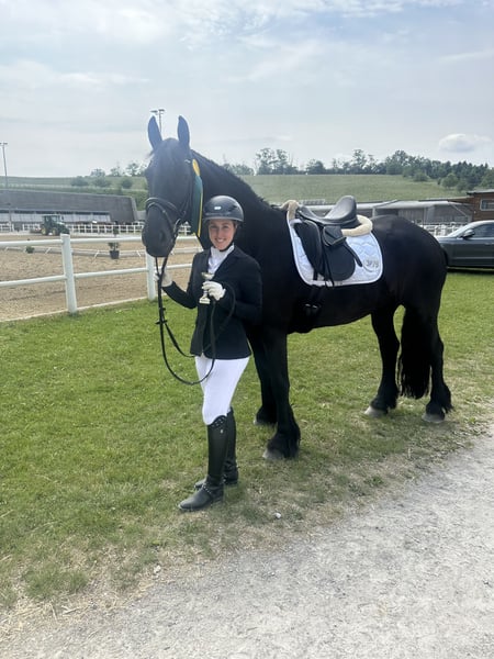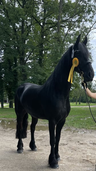 ✨ Reliable Rideability with Top Training and Heart Seeks Loving Home! ✨ This 11-year-old Friesian mare, fully licensed with KFPS papers and holding a Sport-A premium, is a true dream horse for leisure riding, dressage, and breeding. She has been solidly trained up to dressage L-N level, demonstrating a keen willingness to learn, sensitivity, and willingness to perform. She also rides calmly in the arena and is brave enough for trail riding—though she tends to be cautious outdoors, she remains manageable at all times. Character-wise, she is a real gem: calm, child-friendly, affectionate, and very cuddly—she doesn’t buck and approaches work with enthusiasm and joy. Breeding: She has already foaled a beautiful filly without complications and is suitable for breeding, given her papers and Sport-A status. Special features (disclosed openly): * She suffers from a chronic phlegmon, which is well-managed with proper care (regular exercise, clean stable environment, and bandaging if necessary). * Additionally, she has a mild summer eczema, which is very manageable with a turnout rug and appropriate skincare products. Apart from these well-controlled issues, she has never been ill and has no other health problems. She is in excellent condition, fit, and performance-ready, with no notable issues in daily handling. She is only available for turnout or free-range management, as regular movement and thoughtful husbandry are essential for her well-being. Priority over price. She is being sold well below her actual value because, for us, a suitable, experienced, and loving home comes first. We wish for owners who will responsibly support her special needs and give her a permanent, caring home.
