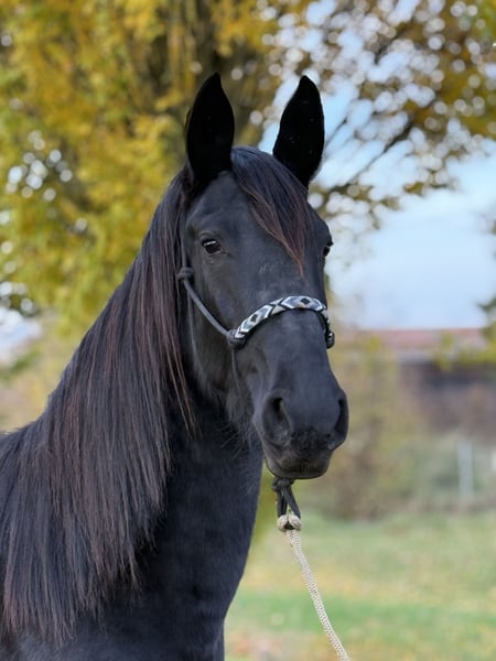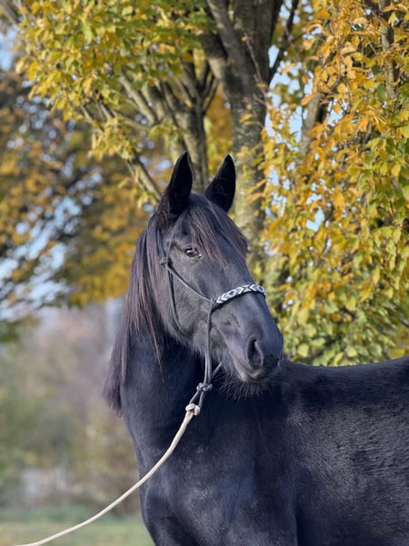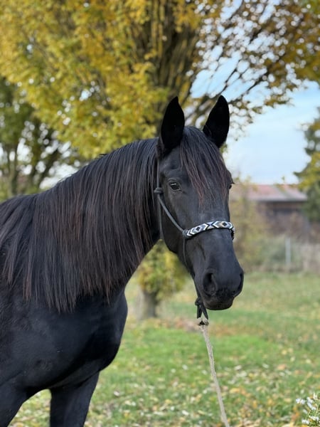 FREISIAN MIX, Black Mare, 4 Years Old – Gentle Heart for Trail Riding & Family Sometimes you come across a horse that simply does everything right: friendly in expression, clear in mind, and calm in everyday life. This beautiful, cream-colored Freisian cross mare is looking for her special person. Someone who appreciates her kind heart and enjoys a straightforward partner for leisure riding and trail adventures. Key Details: - Breed/Color: Freisian cross, black (rapp) - Age: 4 years - Height: approximately 1.60 m (around 15.3 hh) - Temperament: very well-behaved, lovable, easygoing - Upbringing & Social Behavior: raised in a herd, well-socialized, completely compatible - Housing: familiar with pasture turnout as well as stable with paddock - Training: lunged, solidly backed by a professional in a horse- and age-appropriate manner, always well-behaved - Handling: farrier-friendly, loading-friendly, uncomplicated in daily handling - Health: barefoot (not shod) - Veterinary: minor health check-up with no findings - Suitability: ideal for families, re-entrants, and riders who enjoy trail riding and are looking for a partner for memorable moments in the saddle Why you simply have to like her? This mare has what you want in a reliable leisure horse: resilience, good manners, and a friendly, cooperative nature. She moves freely and relaxed, has a pleasant temperament, and makes it easy for her handler to build trust. Her lovable character and her cream-colored exterior make her a true heart horse—beautiful to look at and even more delightful to handle. Important Notes (Fair & Transparent): - She is young (4 years old) and, despite her good behavior, still in her learning phase. Regular, horse-appropriate training is expected. - Very suitable for re-entrants, ideally with professional instruction to ensure continued safe progress together. - Viewing, ground work, and trial riding are possible by arrangement. We value harmonious matching and sufficient time. If desired, the mare can stay on for further training. For serious inquiries, please call us, and we will arrange a meeting to get to know each other. TEL 01709343872