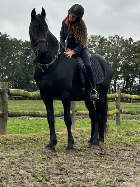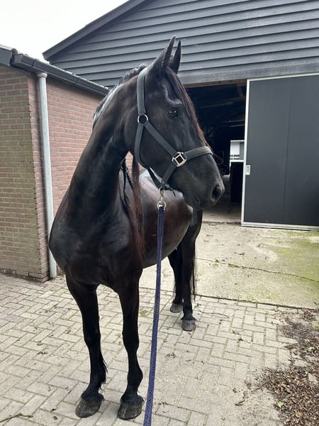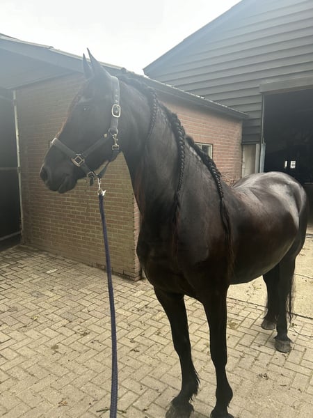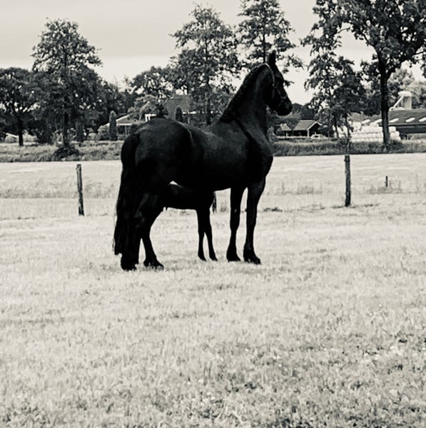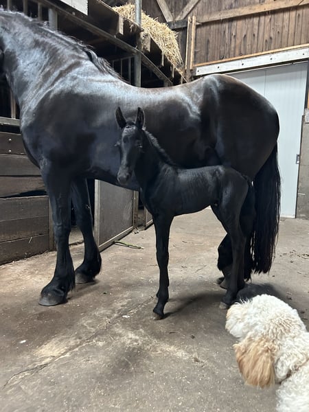 Beautiful luxurious mare with a colt foal by Tijmen. Slimly built, with a full tail and mane. Jet-black coat, noble head. She has had four foals and foals easily without assistance. Inbreeding coefficient 1.37, relatedness 18.8, mare line 049. She is leaving with a heavy heart due to the end of her breeding career. She is trained but has been standing idle for some time due to a foal at her side.
