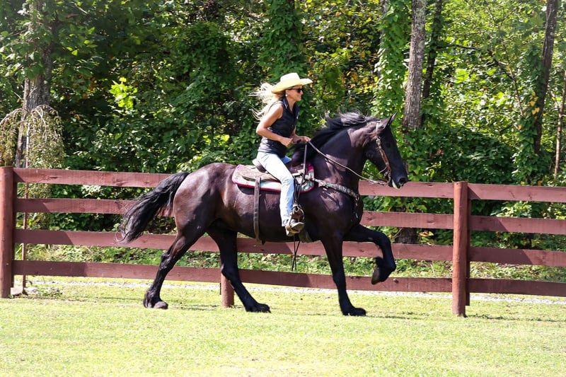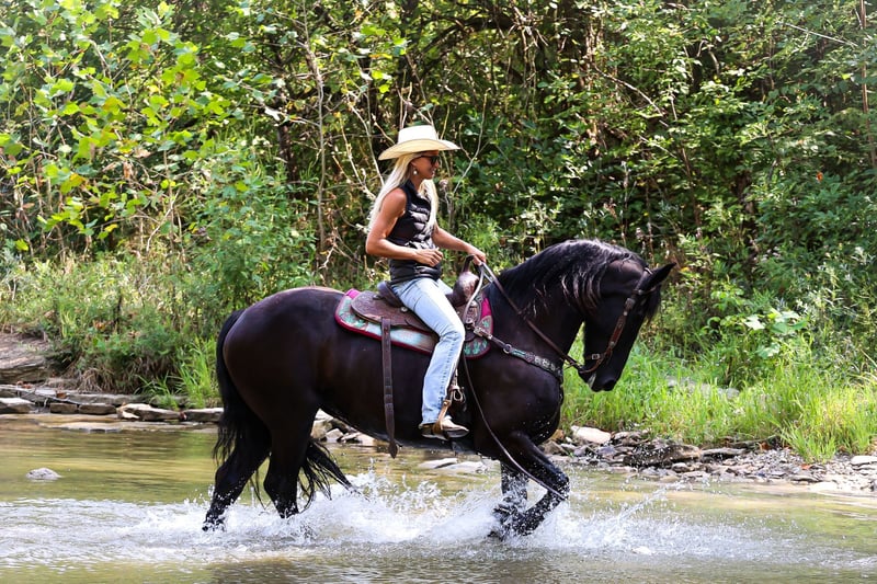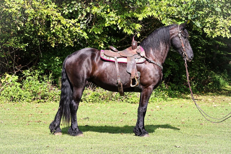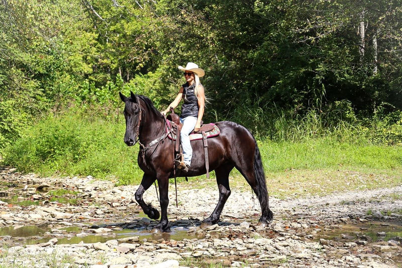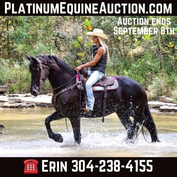 ONLINE AUCTION Place your bids at www.PlatinumEquineAuction.com Starting Bid $3500 Auction ends September 8th, 2024 Need a new saddle? Check out White Rock Saddles on our website or Facebook! This is “ALEXIS LA KAYMON”, a registered black FRIESIAN SPORT HORSE MARE that is broke to ride and drive. She is 16 hands tall and 7 years old. She is a very sensible, experienced, and well trained mare that has been used on the farm. She has also been driven on the main roads and is traffic safe. She is not spooky of side by sides, motorcycles, etc. She is a brave mare that will go anywhere you point her. She rides out alone with confidence. She walks out nicely, has a fancy jog, and a floating canter. She stops easily, backs up, stands to harness, hitch, tack, mount, and groom. She is a fancy Friesian Sport Horse with size, ability, brains, and the training to make her new owners proud. She lopes off with no hump and no buck. For more pics call H&R Horses Erin 304-238-4155 Located in Flemingsburg, KY. ONLINE AUCTION Place your bids at www.PlatinumEquineAuction.com Starting Bid $3500 Auction ends September 8th, 2024 Need a new saddle? Check out White Rock Saddles on our website or Facebook!