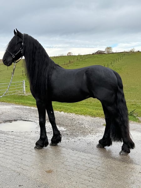 Majestätischer Ster-Friesenhengst lackschwarz mit Ausstrahlung!!! Zum Verkauf steht ein beeindruckender 5-jähriger Ster-Friesenhengst mit hervorragender Abstammung. Roy hat einen Stockmass von 163 cm und vereint Typ, Ausdruck und Qualität auf höchstem Niveau. Er besticht durch seine majestätische Erscheinung, viel Behang und einen ausdrucksstarken edlen Kopf. Seine schwungvollen, raumgreifenden Gänge mit viel Mechanik und Tragkraft machen ihn sowohl für den Fahrsport als auch für repräsentative Auftritte äußerst interessant. Charakterlich zeigt er sich absolut Kopfklar, menschenbezogen und leistungsbereit. Er ist gesund, korrekt gebaut und überzeugt durch seine positive Arbeitseinstellung. Ein Hengst mit Präsenz, Qualität und Perspektive-ideal für ambitionierte Reiter oder Fahrer die Wert auf Typ,Bewegung und Abstammung legen. Weitere Informationen gerne auf Anfrage.