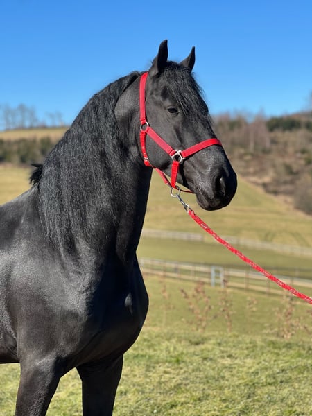 Rudger is affectionately called Rüdi by us. He came to us as a foal with his mother. We have lovingly and socially raised him, backed him, and driven him. Rudger reached the second viewing at the stallion licensing this year, where his path towards becoming a breeding stallion ended. He has a healthy large vet check and semen sample. He is currently still a stallion but can be castrated upon request. However, he is manageable as a stallion and does not show any stallion behavior under saddle. He has never been sick and is fully vaccinated (Influenza, Tetanus, Herpes), regularly dewormed, and has been presented to the farrier and the dentist. Rudger is farrier-friendly and loading-friendly. Rudger is ridden according to his age and is currently being gently further trained by us. He is light to ride and wants to please the rider and learn new things. He is quite interesting for sport-oriented riders because he enjoys dressage work and is finely ridden. Getting on and riding away is not a problem. Bucking, rearing, or taking off is not in his nature. We are looking for a loving new home for him, where he will be used for leisure activities or basic sports and can become a wonderful family member with plenty of cuddle time.