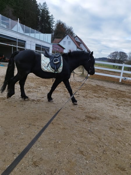 For sale is our 10-year-old Friesian-Fell Pony cross stallion, Alecandro, with an approximate height of 1.60 meters (16.1 hh). He is a striking black stallion, currently barefoot but also shod if needed. Alecandro is familiar with saddle, bridle, and rider’s weight. He has been ground-driven for leisure and has a solid foundation; however, he still requires calm, consistent training to build confidence and routine. He was backed some years ago, but his experience under harness is unknown. He is a spirited stallion: sensitive, attentive, and very present in handling. Therefore, he is only suitable for experienced horse owners, ideally with stallion handling experience. NOT suitable for beginners or children. Unfortunately, Alecandro has eczema (requiring appropriate management) and is also shod. Loading requires patience and time, and further training in this area is welcome. Location: 84550 Feichten an der Alz Price: €1,500 negotiable Note for interested parties: Alecandro will not be sold under time pressure. We are looking for a suitable home where he can settle in calmly and feel comfortable. If genuinely interested, please send a message with a brief introduction, your experience, and your stabling situation.