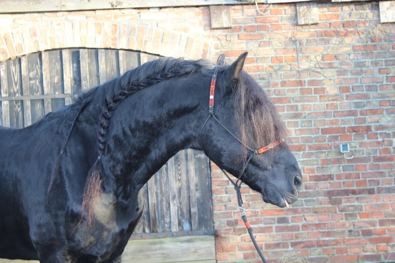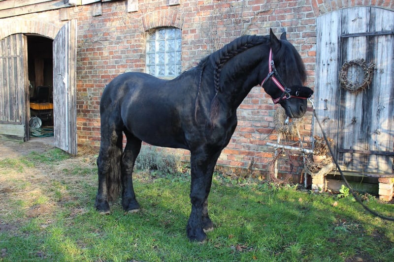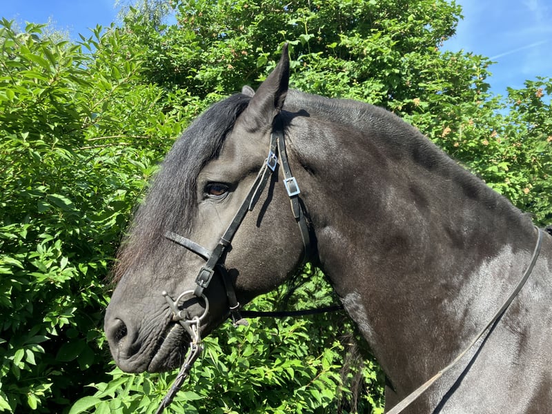 Today unfortunately rarely found: Baroque Friesian of the old type! For sale is an impressive Friesian stallion, born in 2016. A Friesian still of baroque type with beautiful elevation and a height of 158 cm, he is a real eye-catcher! This charming stallion is excellent for leisure activities. Jasper loves long, leisurely rides and is always calm and relaxed. He is well-mannered, sociable, and has a gentle nature, making him an ideal partner for relaxed rides and cozy hours in the countryside. Jasper was started under saddle at the age of 7. Driving would need to be restarted, as he has not been driven since then. Additionally, he was very late under saddle, and I would describe his training level as basic in all gaits. Jasper requires a loving, consistent handler. He responds to strictness and imbalance by stopping. He remains friendly but then parks himself. For his person, he would go through fire. Jasper needs stability and a fixed point of reference. I will only let him go to the right person! Pictures and videos will only be sent upon telephone request. He has a passport without lineage! A veterinary check including X-rays from 2024 is fine! Teeth done, regular osteopathy, and hoof care every four weeks. Jasper can be castrated on-site or at a nearby clinic. This is up to the buyer. Please consider that Jasper is a living being, and the data provided here is given without any warranty. If you are interested or have further questions, I am happy to assist.