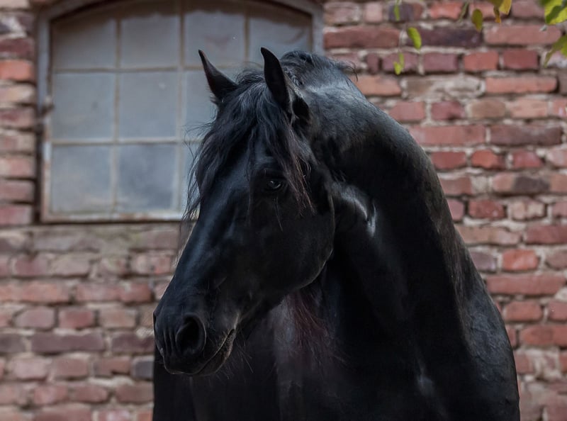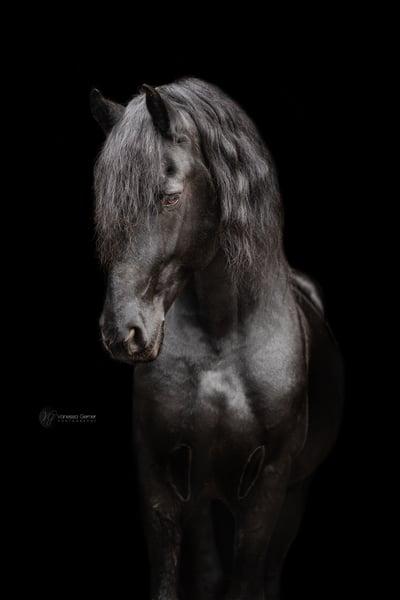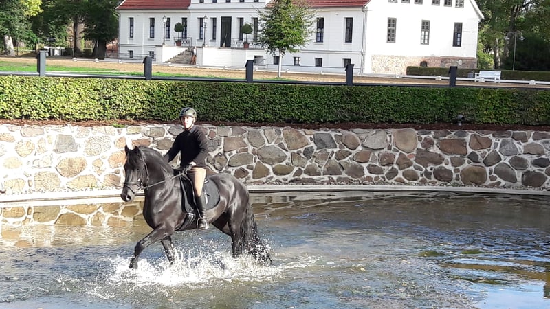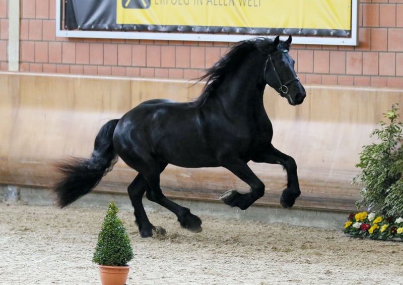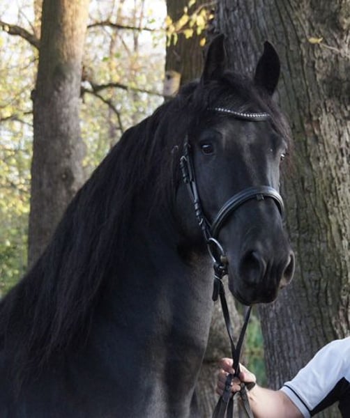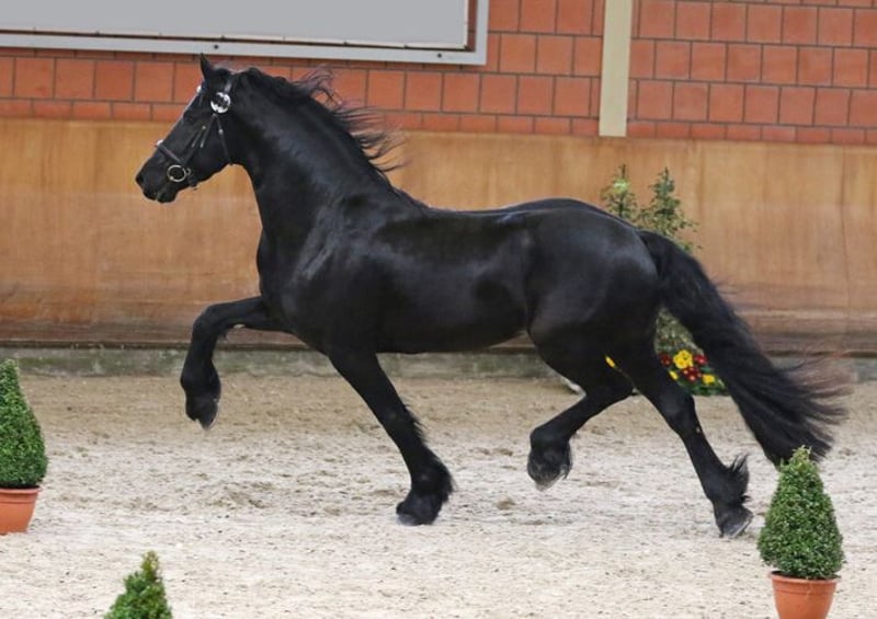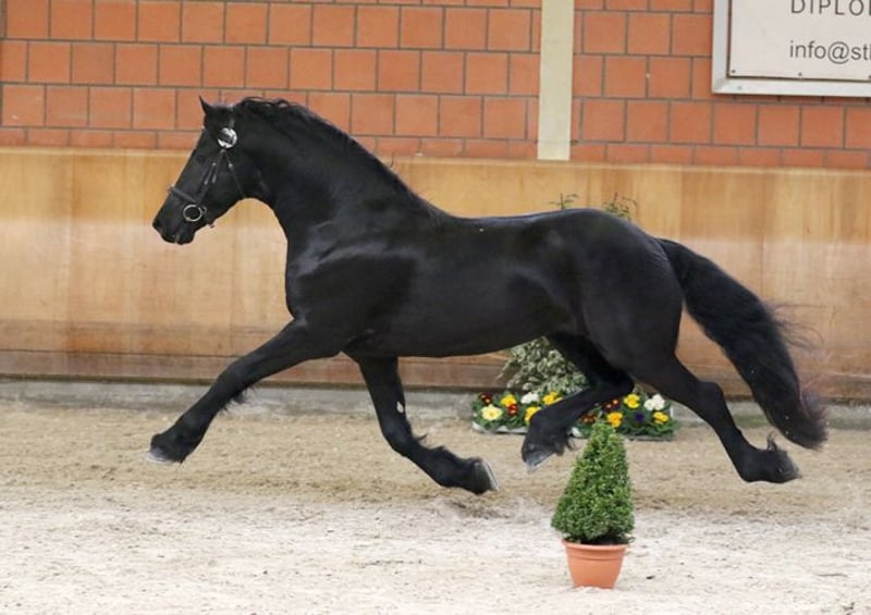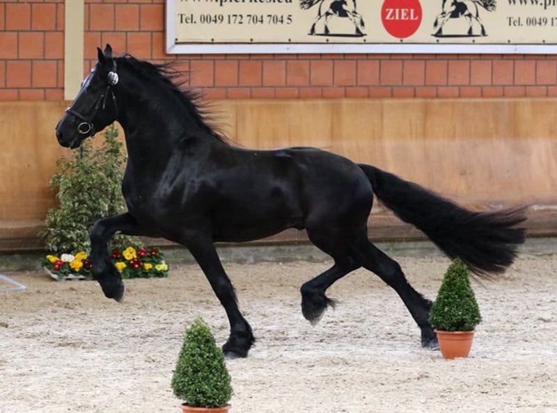 Tiark von der Kornsmühle Friesian horse, born 2014, black stallion, height 1.67 m HB 1 stallion - licensed and performance tested Not a carrier of the genetic defects hydrocephalus and dwarfism, free of chestnut factor (Rotgen), homozygous black Tiark von der Kornsmühle is a son of the highly successful Norbert 444 Pref. Sport and the model and premium mare Finja von der Kornsmühle M, S, Pr.St. He has powerful and ground covering gaits with a lot of drive from the hindquarters and convinces with his good rideability and constant willingness to perform in combination with his very people-oriented and lovable character. His good interior and exterior, his excellent pedigree and an inbreeding factor of 0.0% are very interesting for breeding. His offspring are also convincing: typey, noble and extremely strong-moving foals that have already been awarded high ratings as champion foals of various years and gold-winning offspring. Tiark is also an interesting sire for mares of other breeds. In addition to pure Friesian foals, he already has some very beautiful black pinto offspring. Tiark von der Kornsmühle is a licensed and performance-tested stallion. He completed his 50-day performance test in Redefin with very good marks in all disciplines. He is registered in Stallion Book I and is available to all breeds. Fresh semen dispatch via the EU insemination station Triple J Stables. Frozen semen via the EU insemination station Freeze & Breed.