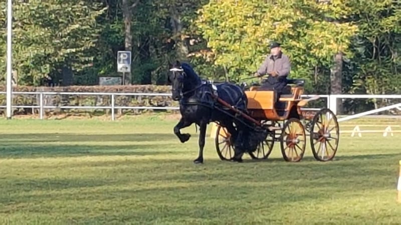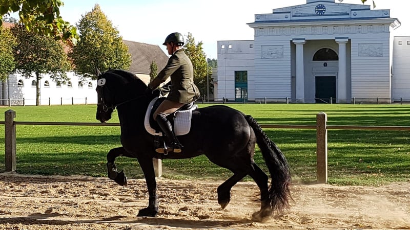 Tiark von der Kornsmühle Caballo Frisón, nacido en 2014, negro, altura 1,67 m HB 1 - semental aprobado y probado en rendimiento No portador de los defectos genéticos hidrocefalia y enanismo, libre de factor castaño (rojo), de pura raza negra Tiark von der Kornsmühle es hijo del exitoso Norbert 444 Pref. Sport y de la yegua modelo y premiada Finja von der Kornsmühle M, S, Pr.St. Posee pasos poderosos y amplios con mucho empuje desde la parte trasera y destaca por su buena montabilidad y constante disposición al trabajo, junto con su carácter muy sociable y encantador. Su buen interior y exterior, su excelente pedigree y un factor de endogamia del 0,0% son muy interesantes para la cría. También su descendencia es impresionante: potros con tipo, elegantes y de gran capacidad de movimiento, que ya han sido galardonados como potros ganadores de diferentes años y descendencia premiada con oro. Para yeguas de otras razas, Tiark también es un interesante reproductor. Así, además de potros de pura raza frisona, ya ha tenido algunas muy bonitas crías de color negro y blanco. Tiark von der Kornsmühle es un semental aprobado y probado en rendimiento. Su prueba de rendimiento de 50 días en Redefin la completó con muy buenas calificaciones en todas las disciplinas. Está inscrito en el Libro de Sementales I y está disponible para todas las razas. Envío de semen fresco a través de la estación de inseminación EU Triple J Stables. Semen congelado a través de la estación de inseminación EU Freeze & Breed.