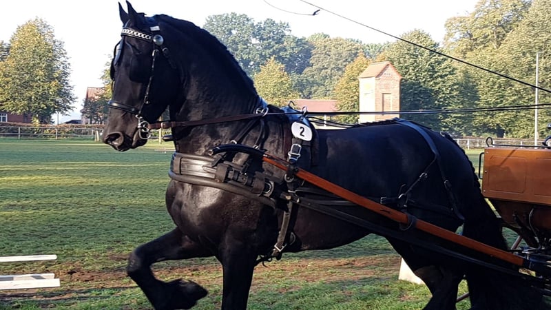 Tiark von der Kornsmühle Friesenpferd, geb. 2014, Rappe, Stockmaß 1,67 m HB 1-Deckhengst – gekört und leistungsgeprüft Kein Träger der Gendefekte Wasserkopf und Zwergenwuchs, frei von Fuchsfaktor (Rotgen), reinerbig schwarz Tiark von der Kornsmühle ist ein Sohn des hocherfolgreichen Norbert 444 Pref. Sport und der Modell- und Prämienstute Finja von der Kornsmühle M, S, Pr.St. Er verfügt über kraftvolle und raumgreifende Gänge mit viel Schub aus der Hinterhand und überzeugt mit seiner guten Rittigkeit und stetiger Leistungsbereitschaft in Verbindung mit seinem sehr menschenbezogenen und liebenswerten Charakter. Sein gutes Interieur sowie Exterieur, seine ausgezeichnete Abstammung und ein Inzuchtfaktor von 0,0% sind für die Zucht sehr interessant. Auch seine Nachzucht überzeugt: Typvolle, edle und äußerst bewegungstarke Fohlen, die mit hohen Bewertungen bereits als Siegerfohlen verschiedener Jahrgänge und goldprämierte Nachkommen ausgezeichnet wurden. Für Stuten anderer Rassen ist Tiark ebenfalls ein interessanter Vererber. So hat er neben reinen Friesenfohlen bereits einige sehr schöne Schwarzscheck-Nachkommen. Tiark von der Kornsmühle ist ein gekörter und leistungsgeprüfter Hengst. Seine 50-tägige Leistungsprüfung in Redefin schloss er in allen Disziplinen mit sehr guten Noten ab. Er ist im Hengstbuch I eingetragen und steht allen Rassen zur Verfügung. Frischsamenversand über die EU-Besamungsstation Triple J Stables. Tiefgefriersamen über die EU-Besamungsstation Freeze & Breed. Frühbucher-Rabatt bis zum 31.01.2026! ================================== Decktaxensplitting und Rabatt bei Anmeldung mehrerer Stuten - Fragen Sie uns nach den aktuellen Deckbedigungen und melden Sie Ihre Stute rechtzeitig an. ------------------------------------------------------------------------------------------------------------------