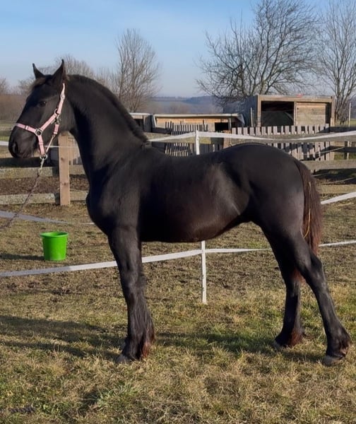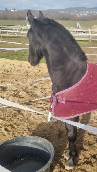 Zum Verkauf steht hier ein absolutes Ausnahme Friesenfohlen! Er ist erst 8 Monate alt und soooo unglaublich barock. Kennt Führen und gibt auch schon die Hufe. Wurde auch schon problemlos verladen und steht still beim Fahren. Ganz unkompliziert im Umgang. Bei dem letzten Foto sieht man auch den Vater. Er wird unglaublich barock werden - wie man es nur mehr selten findet!!! Endstockmaß ca 165 cm. Mutter und Vater waren beide ganz barock!