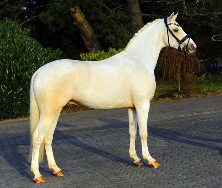 GENSCHER è l'attuale stallone vincitore della licenza ZFDP 2017 di Kreuth. È un pony top per origine e talento. Il figlio del doppio Bundeschampi- on Golden West, allevato da Werner Berensmeyer, è l'ultimo figlio della leggendaria DESIREE von Domingo, una delle cavalle della Westfalia, che a quel tempo era responsabile dello stallone vincente Cezanne de Luxe, del Cezar Obolensky con licenza e di sua sorella la Bundeschampionesse C major (Eva Möller). Molte delle sue figlie sono diventate cavalle premium statali, tra cui la nostra Gwen Stefania, che è stata un'ultima cavalla in Westfalia l'anno scorso. Anche i nostri stalloni Kachunga & Adoro appartengono a questa famiglia di successo. GENSCHER ha un fisico quasi perfetto con linee e forme generose, e allo stesso tempo splendidamente realizzato, un pony di cui innamorarsi. Con tre ottime andature di base, può brillare sia in occasione della licenza, sia nel lavoro quotidiano sull'affondo. I primi test sotto la sella sono promettenti. Uno stallone pony che ha tutto per suscitare scalpore sia nello sport che nell'allevamento. La tribù dei Desiree, vincitrice Westf. Eliteschau'96 e vincitore Bundesponyschau'96, ha presentato tra gli altri il gek. Stalloni Cezanne de Luxe (tra gli altri Siegerhengst'08, Westfalenchampion'09) u. Cezar Obolensky v FS Champion de Luxe, Going Top (1° vincitore riserva 2000/int. Pony FEI) di Going East e Bundeschampionesse Do major (Eva Möller) Stalloni autorizzati: Oliver K WE (stallone vincitore Weser-Ems'11, Vice-Campione'13) di Ombri B, Lagos (2° seme di riserva MS-Handorf'03/Spr.M) di Langar, Good One di Going East, Brentano di Bavarottie Pony sportivi: Caruso W 2 (Dr.M) v. Courage, Jil's Jungle Prince (int. Spr.M) v. Jacobss. Rocky, la sorellina di Madonna (Fap.S) e Madonna 51 (Fap.S) di Merlino, nonché ADORO (2a vincitrice della riserva Ms-Handorf) e KACHUNGA, stallone premium Münster-Handorf. GENSCHER è autorizzato a Kreuth, è stato richiesto il riconoscimento per la Westfalia. Tassa di inseminazione 250,00 Euro Quota gravidanza 200,00 Euro