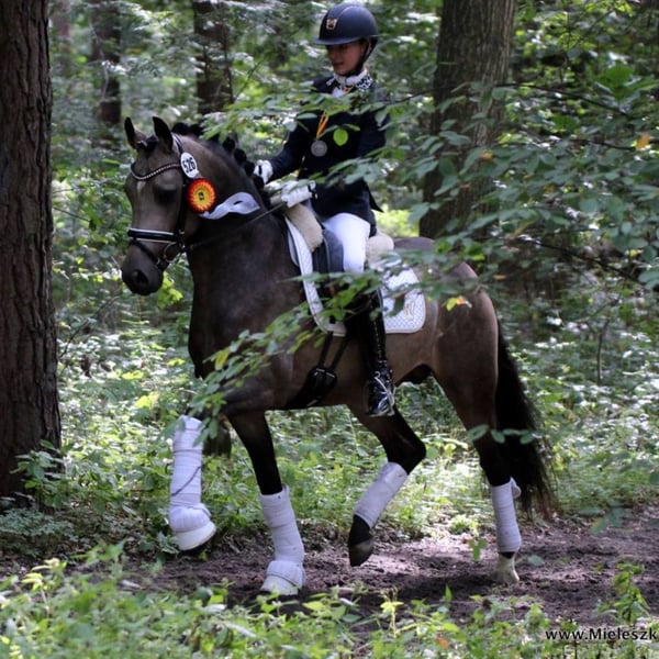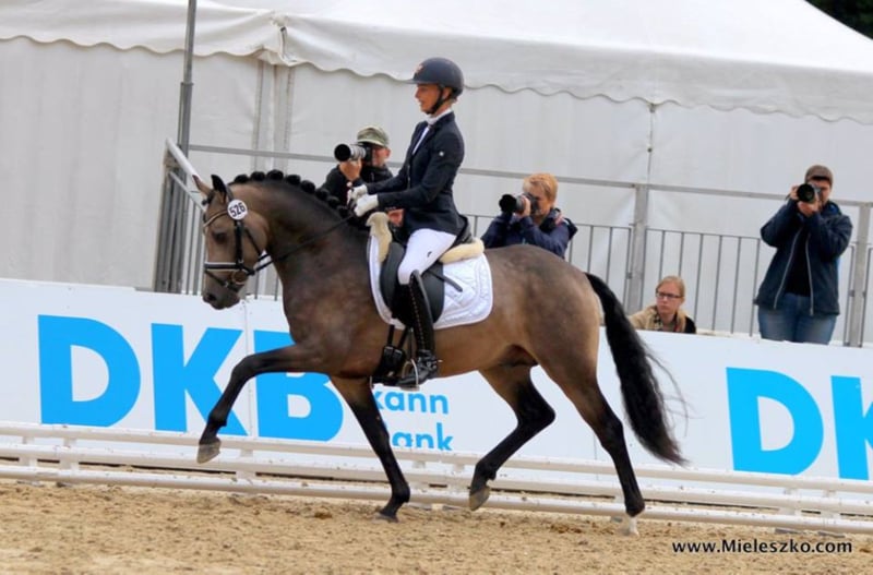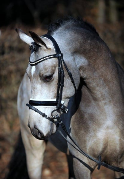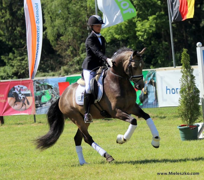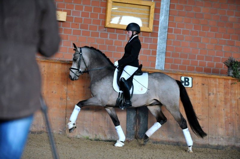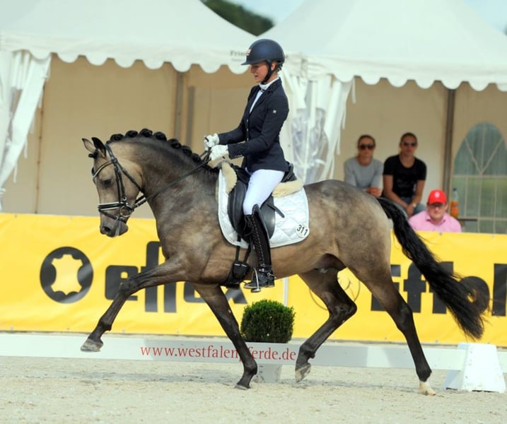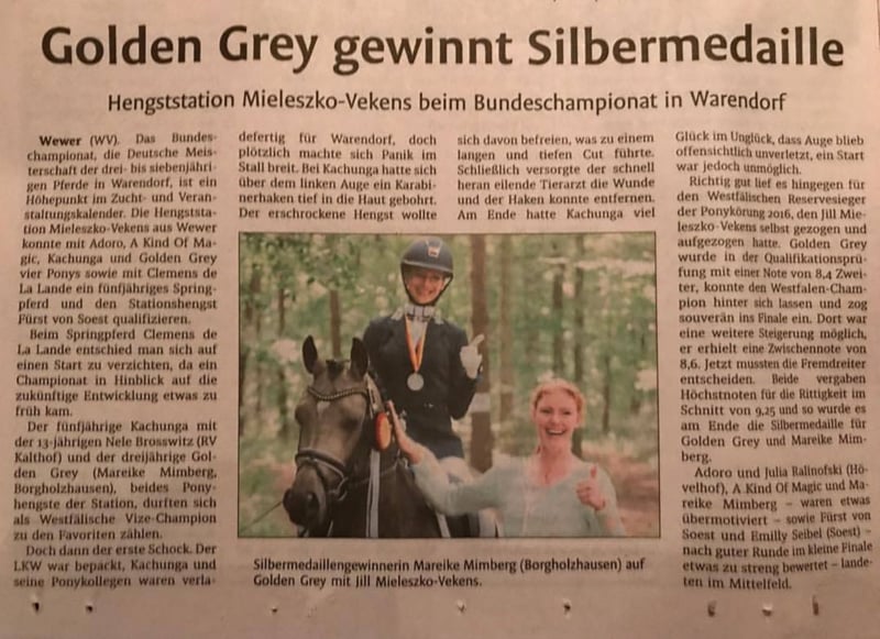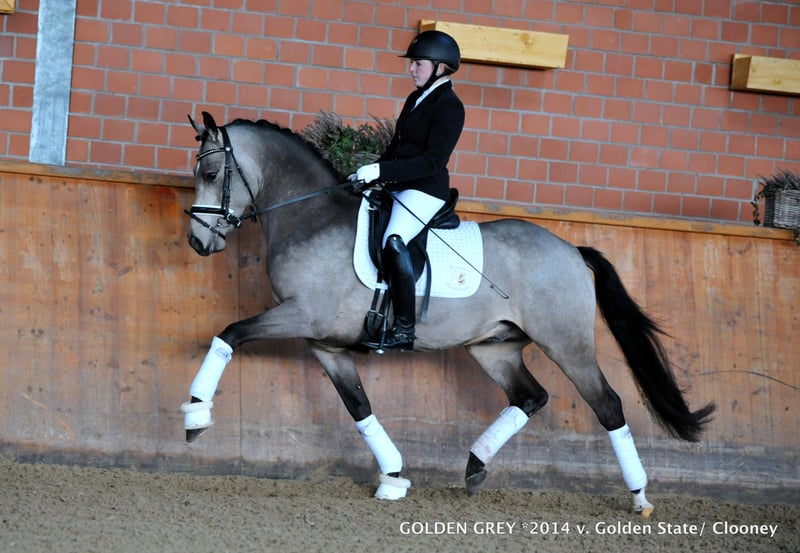 GOLDEN GREY NRW begeisterte auch unter dem Sattel von Anfang an. Diese ersten Eindrücke bestätigten sich im Laufe der Saison 2017 voll und ganz. Bei seinem ersten Turnierstart konnte er in Hövelhof sofort die Reitpferdeprüfung gegen Großpferde gewinnen. Im Rahmen der Westfalen Woche wurde er Vize Westfalen Champion. Beim Bundeschampionat in Warendorf gab es durchweg hohe Noten und jeweils Platz 2. Am Ende hieß es schließlich 8,6 & Tages-Höchstnoten für Rittigkeit von den Fremdreitern, was SILBER für GOLDEN GREY NRW und Mareike Mimberg bedeutete..Mit Spannung erwarten wir den ersten Fohlenjahrgang von GOLDEN GREY NRW der auf der Ende Juni auf Stutenschau in Delbrück prä- sentiert wird.