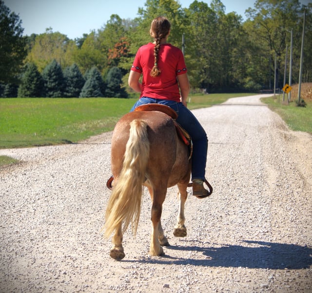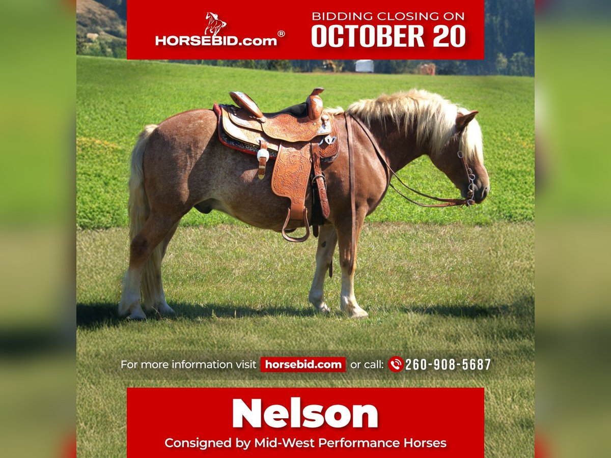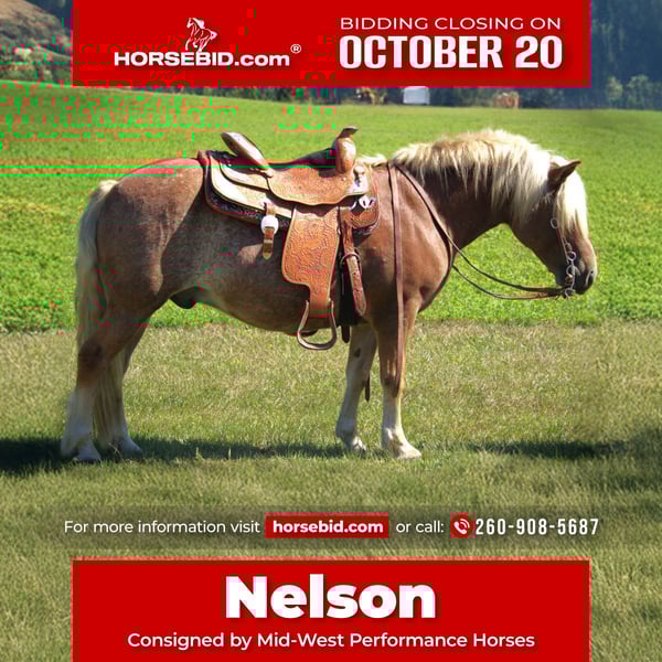 ♦️ 𝐭𝐡𝐞 𝐀𝐌𝐄𝐑𝐈𝐂𝐀𝐍 𝓕𝓪𝓵𝓵 𝓒𝓵𝓪𝓼𝓼𝓲𝓬 ♦️ Happening now thru MONDAY | OCTOBER 20th - Available EXCLUSIVELY on HorseBid's website! For more details and to register visit: www.Horsebid.com CONSIGNOR CONTACT: Mid-West Performance Horses 260-908-5687 LOCATION: Saint Joe, IN BREED: Halflinger REGISTERED: No COLOR: Red HEIGHT: 13.2 AGE: 9 GENDER: Gelding Nelson is a 9 year old Haflinger gelding standing a sturdy 13.2 hands high. Nelson is built very sturdy and can carry any size of rider! Nelson is a master on the trails and is always sure footed! He will cross any obstacle, go through water, cross logs, go over bridges, through brush, you name it...he will go through it! You can ride Nelson anywhere, on the trails, through town, down the road and he doesnt get exicted! He will walk, trot, lope, with ease in the arena and always picks up the correct lead. Nelson has great brakes, and always stops when asked. His go-button is spot on. He will leisurely plug along on the trails, down the road or in the arena or easily pick the speed up to ride english, jump, or even do some trail obsticals. Nelson loves to jump and looks adorable doing it! He is easy to saddle and un-saddle as well as groom! Nelson would be a great all around family horse to take to local shows for the entire family to show, and do all the events... then turn around and go on a trail ride or camping trip. He is very easy to catch in the field, and is always the first one to meet you at the gate. He loves attention and to be pampered! He does great being turnt out with other horses, mares or geldings. Stands great for the ferrier, and to be bathed. He will stand tied all day and night and never cause a ruckus. He is very low maintenance and will stay nice and plump on just grass hay! He does not require shoes. He loads and unloads like a dream. If your looking for a fun, all around, kid safe, family friendly, anyone can ride gelding...Nelson is your man! Contact April with Mid-West Performance Horses to come check him out, you wont be disappointed!