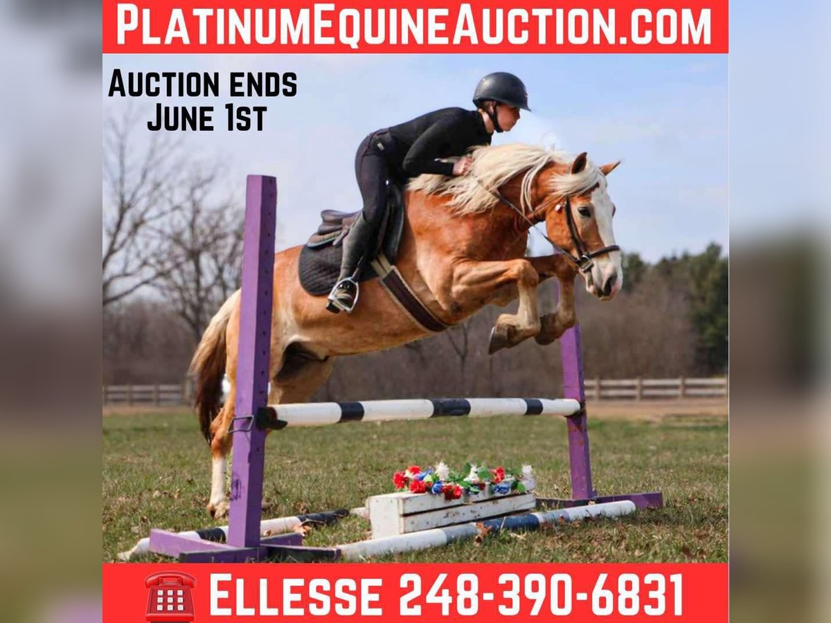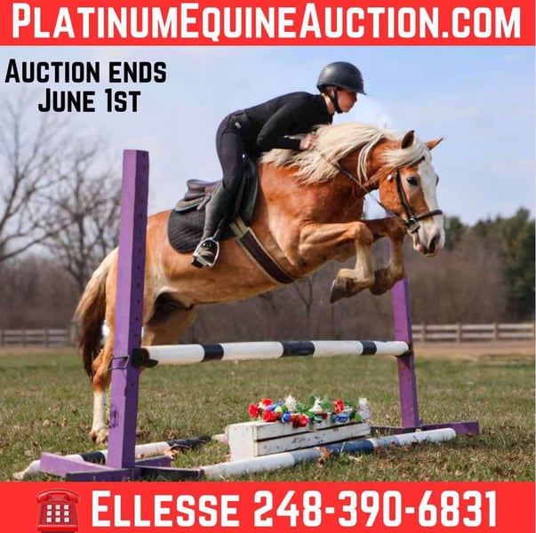ONLINE AUCTION Place your bids at www.PlatinumEquineAuction.com Starting Bid $3500 Auction ends June 1st, 2025 Need a new saddle? Check out White Rock Saddles on our website or Facebook! Meet Duke as we call him! Here’s a registered haflinger that will be hard to beat. With his double mane and long blonde tail he’s as pretty as you would expect, if a horse with his pedigree. Duke is a registered American Haflinger gelding who stands 14.1hh at 4 years old. He is beautifully bred with MIDAS TOUCH and NEIMAN MARCUS on his papers. You’ll put a lot of miles on your truck to find one like him. He’s solid and very dependable. He has nice sporty conformation. Duke walk trot and canters with ease. Duke knows both her leads and has great transitions both upward and downward. All of his gaits are smooth and comfy. Duke has a heart of gold and aims to please every time. He has a quiet with a go with the flow temperament. He has recently started over fences and is a natural at jumping. He holds a slow and steady canter to the jumps. Duke is currently jumping 2ft but he has potential to jump 2’6”. Duke also rides western and trail rides like a dream. He is confident out in the woods. While you’re riding out alone or in a group Duke is always down for a trail ride. Duke is not the spooky type, not much phases him. He has been hauled to different state and metro parks in Michigan, Ohio, and Indiana. He has seen the sites and has all the experience. Duke is also broke to drive. He pulls a cart or buggy and is easy to drive around. On the ground he is patient and respectful. He likes people and loves to show off his personality! Duke even lays down on command! He stands for mounting/dismounting, grooming, and bathing. Duke plays well with other horses and he is an easy keeper! Duke is overall so sweet and very willing! He is smart and learns new things quickly. Duke is an all around girl. He is great for kids and adults on the ground and undersaddle. Please contact Ellesse Schwartz at 248-390-6831 for more information. He is Located in Howell, Michigan 48855. ONLINE AUCTION Place your bids at www.PlatinumEquineAuction.com Starting Bid $3500 Auction ends June 1st, 2025 Need a new saddle? Check out White Rock Saddles on our website or Facebook!