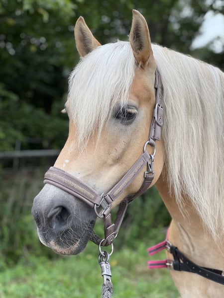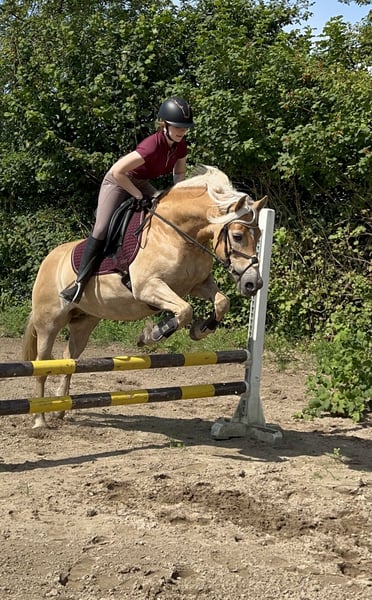 For personal reasons, I have decided to find a good home for my Haflinger mare. She was born in 2013, stands at 1.47m tall, and is sired by the dressage stallion Ammersee. I bought her in 2014 and trained her myself, which is why she is only ridden for leisure. When riding, she is always eager and responds well to the rider's aids. She is motivated when jumping. Trail riding in groups and alone is no problem for her, although she can be a bit curious. Even though she is very sweet and careful with my son, I am not offering her as a children's pony. Currently, she is kept in a paddock where she lovingly leads her herd. Transitioning to a new stable has never been a problem for her, and she can also adapt to a new environment. I hope she continues to live in a paddock. We have tried box housing, but I think she is not comfortable in that setting. She has mud fever on her left hind leg, but we have not had any issues with it for years. On her right hind leg, she has a scar from her young pony days, which is only considered a "cosmetic flaw." She is barefoot and does not require shoes. If you have any questions, feel free to reach out and introduce yourself with a short message. For a meet-and-greet, we charge €20, which will of course be deducted from the purchase price. !Home before price!