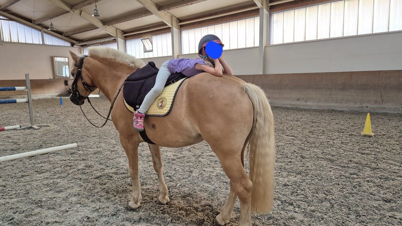 Prinzessin Pippilotta macht sich die Welt, wie sie ihr gefällt. 2 1/2 jährig kam sie zu mir und an Ihrem dritten Geburtstag saß ich das erste Mal auf Ihr. Seit dem macht sie Tag für Tag ihrem Namen alle Ehre. Nach klassischen Grundsätzen ausgebildet beherrscht sie jetzt 6 jährig alle Seitengänge, Schritt Galopp Übergänge, spanischen Schritt und vieles mehr. Sie geht alleine und in der Gruppe brav ins Gelände, wobei sie in der Gruppe lieber vorweg läuft. Ihre Leidenschaft liegt allerdings im Springen. Diese Saison durfte sie etwas Turnier Luft schnuppern, wobei sie von 3 Starts 3x platziert war mit Noten bis 8,0. Sie kennt es von verschiedenen Reitern geritten zu werden, wünscht sich aber eine feste Bezugsperson, mit der sie den Rest ihres Lebens durch ihre kunterbunte Welt Tanzen kann. Auch mit Kindern und Reitanfängern ist immer verlass auf die kleine Püppi. Sie ist ein kekes Pony, dass gern mal etwas Spaß bei der Arbeit hat, aber nie kopflos wird. Aktuell lebt sie mit 24/7 Heu und Wiese im Offenstall in einer gemischten Gruppe, dort ist sie Rang hoch, Kennt aber auch Boxen haltung. Sie kann jederzeit probegeritten werden. Für Fragen stehe ich jederzeit zur Verfügung. 017641573456