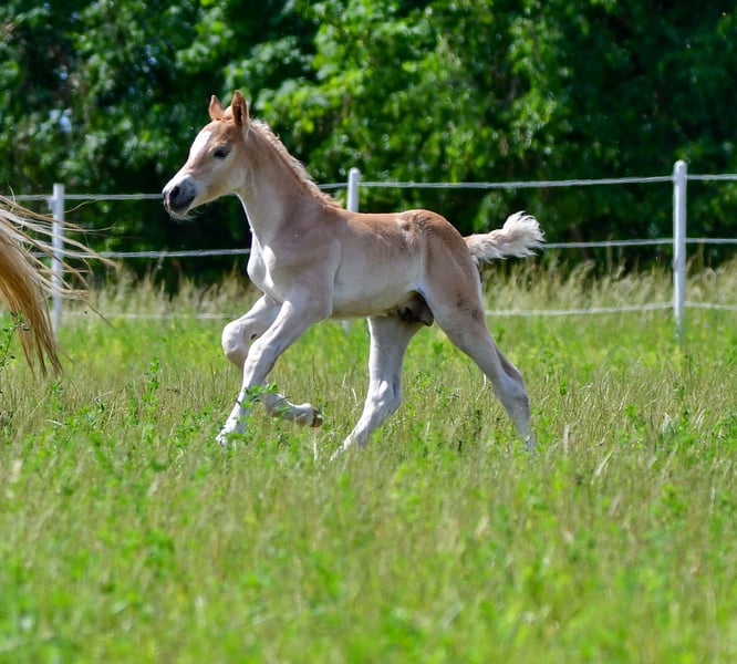 Te koop staat een 5-jarige XXL Haflinger merrie met een uitstekend karakter. Ze toont zich zowel in het dagelijks contact als onder het zadel zeer braaf, zowel in nieuwe omgevingen als in het terrein. Sinds het begin van het jaar wordt ze bereden en toont ze ook veel talent voor springen. Vanwege haar temperament is ze niet geschikt voor beginners. Een merrie die graag opvalt. Ze heeft al een zeer typvolle hengstveulentje, dat zich modern en beweegrijk presenteert. Dit maakt haar interessant voor zowel verdere sportopleiding als als toekomstige fokmerrie. Een bijzonder jong paard. Ze is echt een blikvanger, sterk in type en met veel uitstraling. - Ingeschreven als wedstrijdpaard - Stubuch-inschrijving 7,4
