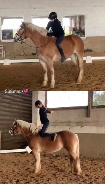 Bjolla ist eine 8 jährige Tiroler Haflingerstute aus der Zucht von Christian Mark. Sie ist 148 cm, im Tiroler Grundbuch I eingetragen. Ihr Vater ist Amerigo, ihre Mutter ist Braveheart von Straden aus einer Nabucco Mutter. Bjolla ist brav im Umgang, schmiede- und verladefromm. Bei uns läuft sie sehr gut barhuf, kann aber auch gerne ihre Hufschuhe mit ins neue Zuhause bringen. Sie ist sicher von Erwachsenen und Jugendlichen in Halle, Feld und Straßenverkehr geritten. Bei der Arbeit braucht sie eine faire aber klare Hilfengebung. Fühlt sie sich ungerecht behandelt, gibt sie Antwort. Für den Schulbetrieb oder unsicheren Reiter ist sie daher nicht geeignet, da sie Fehler nicht immer verzeiht. Eine persönliche Bindung zum Reiter ist wichtig für sie. Sie hat einen eigenen angepassten Westernsattel, der ebenfalls miterworben werden kann. Läuft aber auch gut mit einem englischen Sattel.
