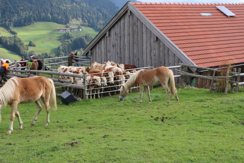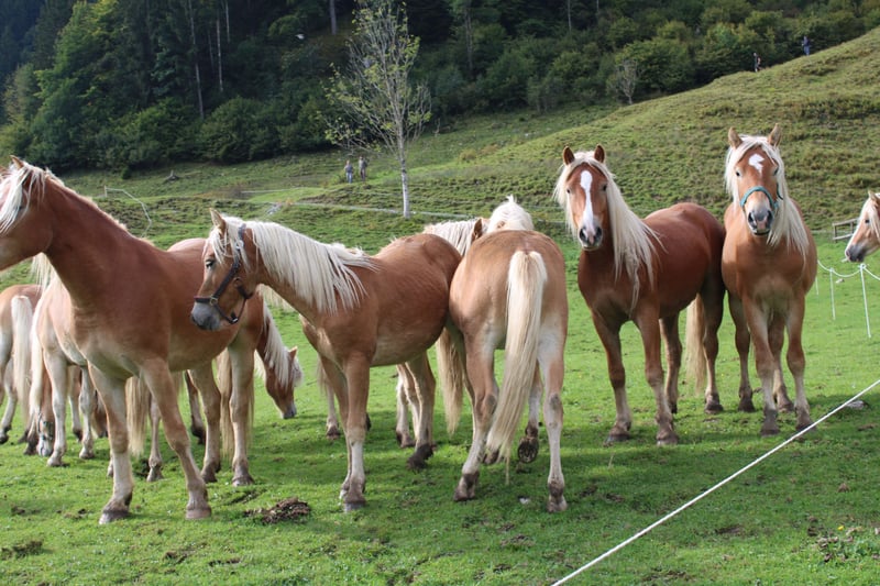 Haflinger-veulen, geboren op 27 april 2024; correcte hengst met een verwachte eindhoogte van 150 cm; vriendelijk, lief, evenwichtig, geïnteresseerd en sociaal; rustige type, mooie stap, braaf bij het hoefonderhoud; probleemloos laden en ontwormen; op papier heeft hij de vereisten voor de fokkerij; zijn moeder heeft hem op 10 maanden gespeend; ook als ruil tegen merrie; - momenteel op de hengstalm; komt waarschijnlijk in september terug; - heeft een totale score van 8,5 behaald bij het "Bayerisch Fohlenchampionat 2024, München"; - is gewend aan straatgeluiden, inclusief sirenes, helikopter- en treinlawaai; Hier een paar indrukken van de alm (30.07). Het heeft dagenlang geregend... dat is te merken aan de paarden; het is een groep van voornamelijk 2-jarigen en enkele veulens; de oudere zijn donkerder, de jongere lichter; vandaag was ik weer boven... stemming beter, de dunne, lichte zijn veulens, de donkere, gespierde zijn 2- tot 3-jarigen;